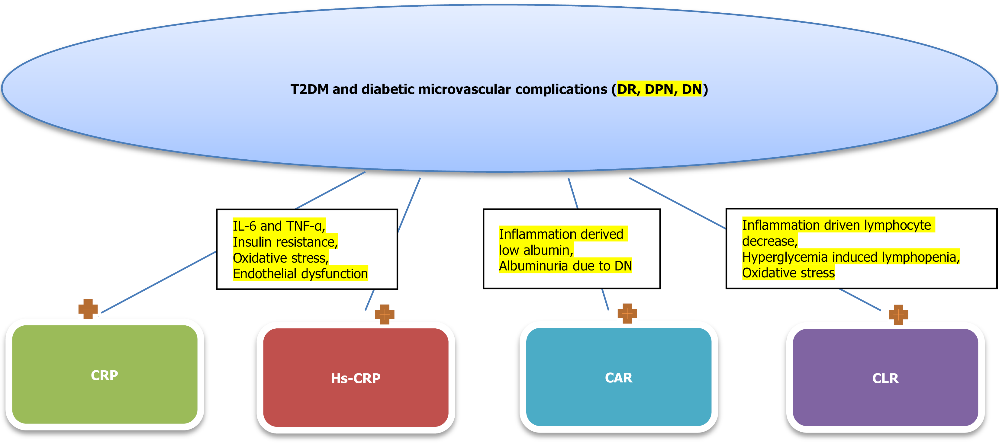 Both C-reactive protein, high sensitivity C-reactive protein, C-reactive protein to albumin ration and C-reactive protein to lymphocyte count ratio are increased in patients with type 2 diabetes mellitus and with diabetic microvascular complications. Moreover, elevated levels of these markers are associated with poor disease control in diabetic population. T2DM: Type 2 diabetes mellitus; CRP: C-reactive protein; Hs-CRP: High sensitivity C-reactive protein; CAR: C-reactive protein to albumin ratio; CLR: C-reactive protein to lymphocyte count ratio; IL-6: Interleukin-6; TNF-α: Tumor necrosis factor-α; DN: Diabetic nephropathy; DR: Diabetic retinopathy; DPN: Diabetic peripheral neuropathy.