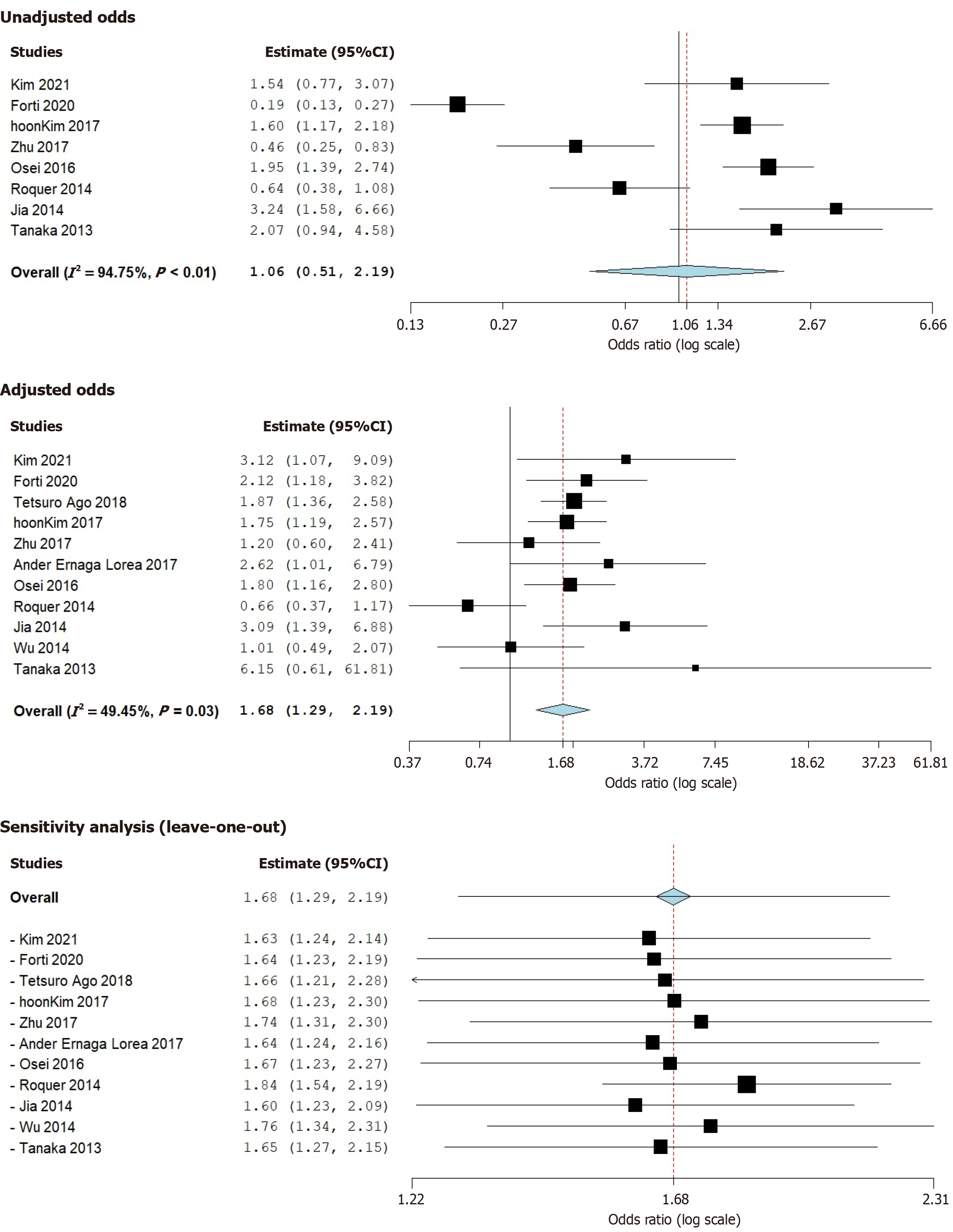 Forest plot: Unadjusted and adjusted analysis of included studies exploring mortality risk in prediabetic post-acute ischemic stroke patients.