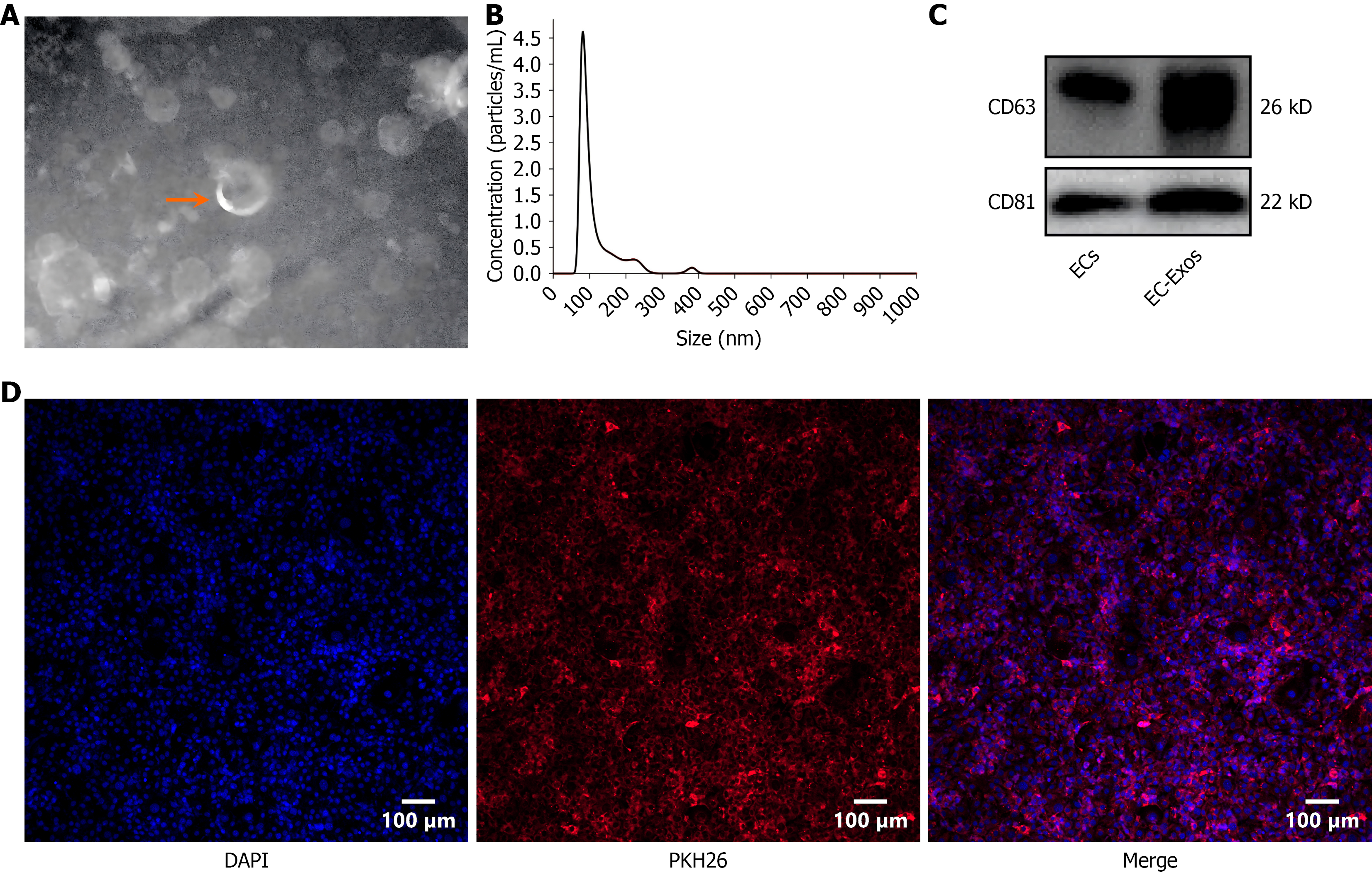 A: Transmission electron microscopy, orange arrows indicate exosomes; B: Nanoparticle tracking analysis for exosome size distribution; C: Western blotting for detection of exosomes surface markers; D: Exosome phagocytosis experiment. ECs: Endothelial cells; EC-Exos: Endothelial cell-exosomes.