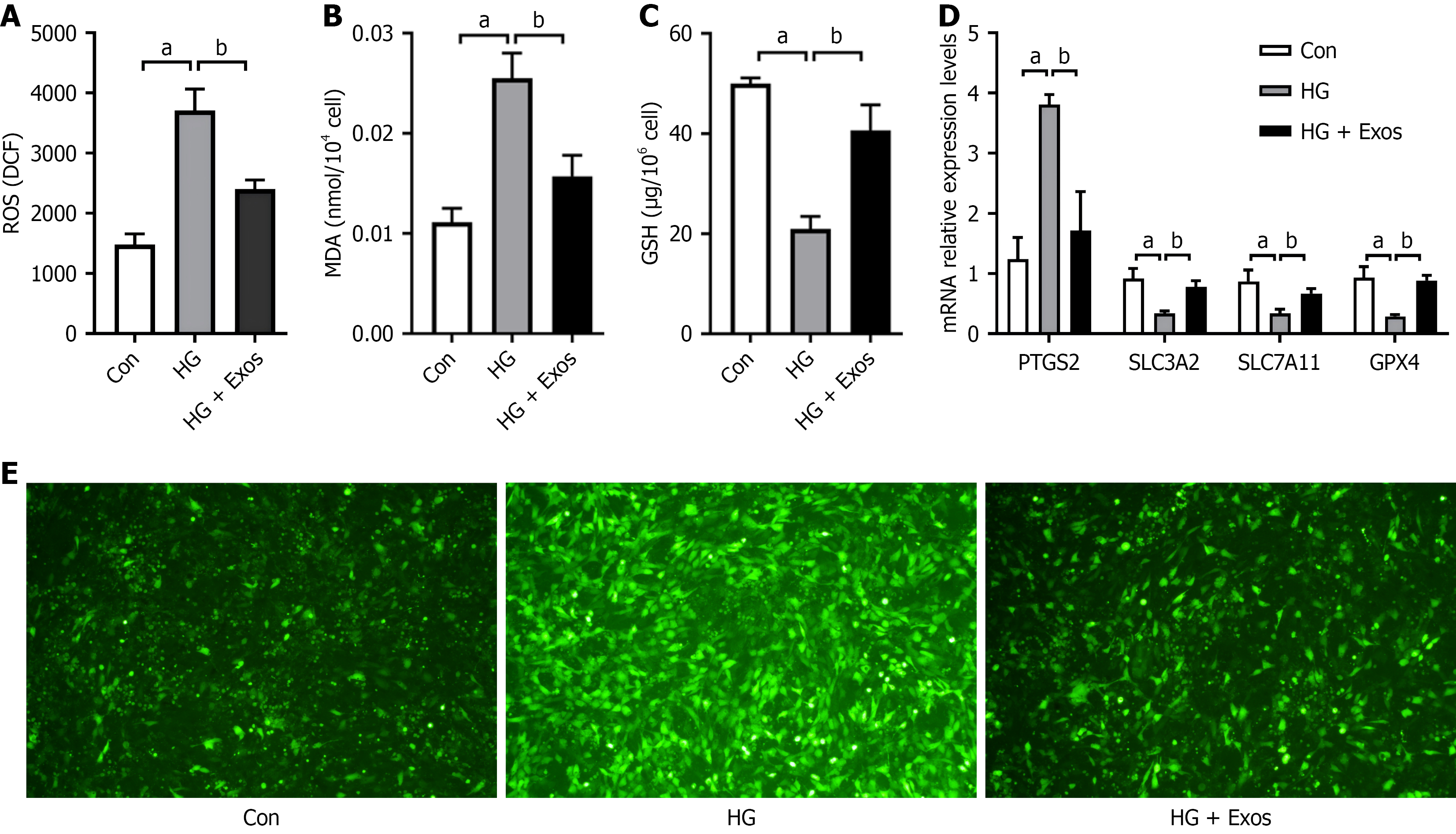 A-C: Comparison of reactive oxygen species levels, malondialdehyde levels and glutathione levels among the control group, high glucose (HG) group, and HG + exosomes (Exos) group; D: Reactive oxygen species fluorescence images of the control group, HG group, and HG + Exos group; E: Comparison of mRNA expression levels of ferroptosis indicators prostaglandin endoperoxide synthase 2, solute carrier family 3 member 2, solute carrier family 7 member 11, glutathione peroxidase 4 among the control group, HG group, and HG + Exos group. The bars indicate the mean ± SD from three independent experiments (n = 3). aP < 0.05 vs control, bP < 0.05 vs high glucose. Con: Osteoblasts treated with normal glucose; HG: Osteoblasts treated with high glucose; HG + Exos: High glucose + endothelial cell-exosomes; ROS: Reactive oxygen species; DCF: Dichlorofluorescein; MDA: Malondialdehyde; GSH: Glutathione; PTGS2: Prostaglandin endoperoxide synthase 2; SLC3A2: Solute carrier family 3 member 2; SLC7A11: Solute carrier family 7 member 11; GPX4: Glutathione peroxidase 4.