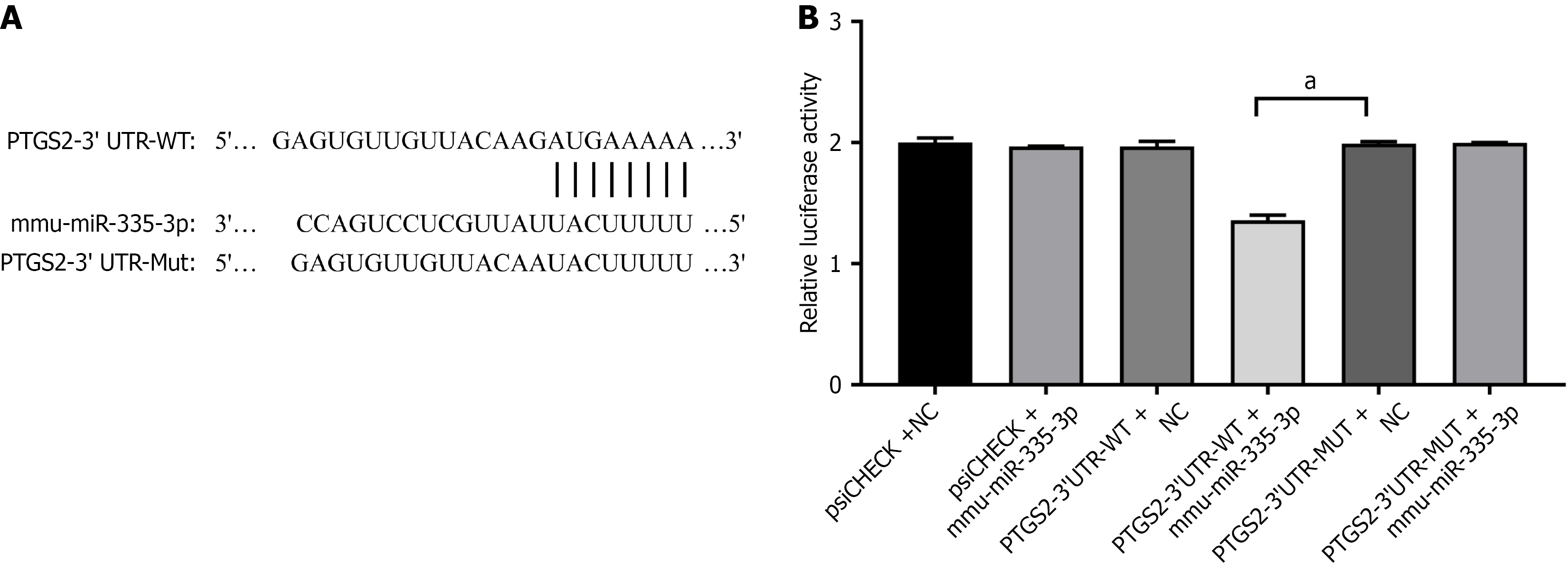 A: MicroRNA binding site database prediction of microRNA-335-3p binding site with prostaglandin endoperoxide synthase 2 3’ untranslated region; B: Dual-luciferase reporter gene assay. aP < 0.05. PTGS2: Prostaglandin endoperoxide synthase 2; UTR: Untranslated region; WT: Wild type; miR: MicroRNA; Mut: Mutant; NC: Negative control.
