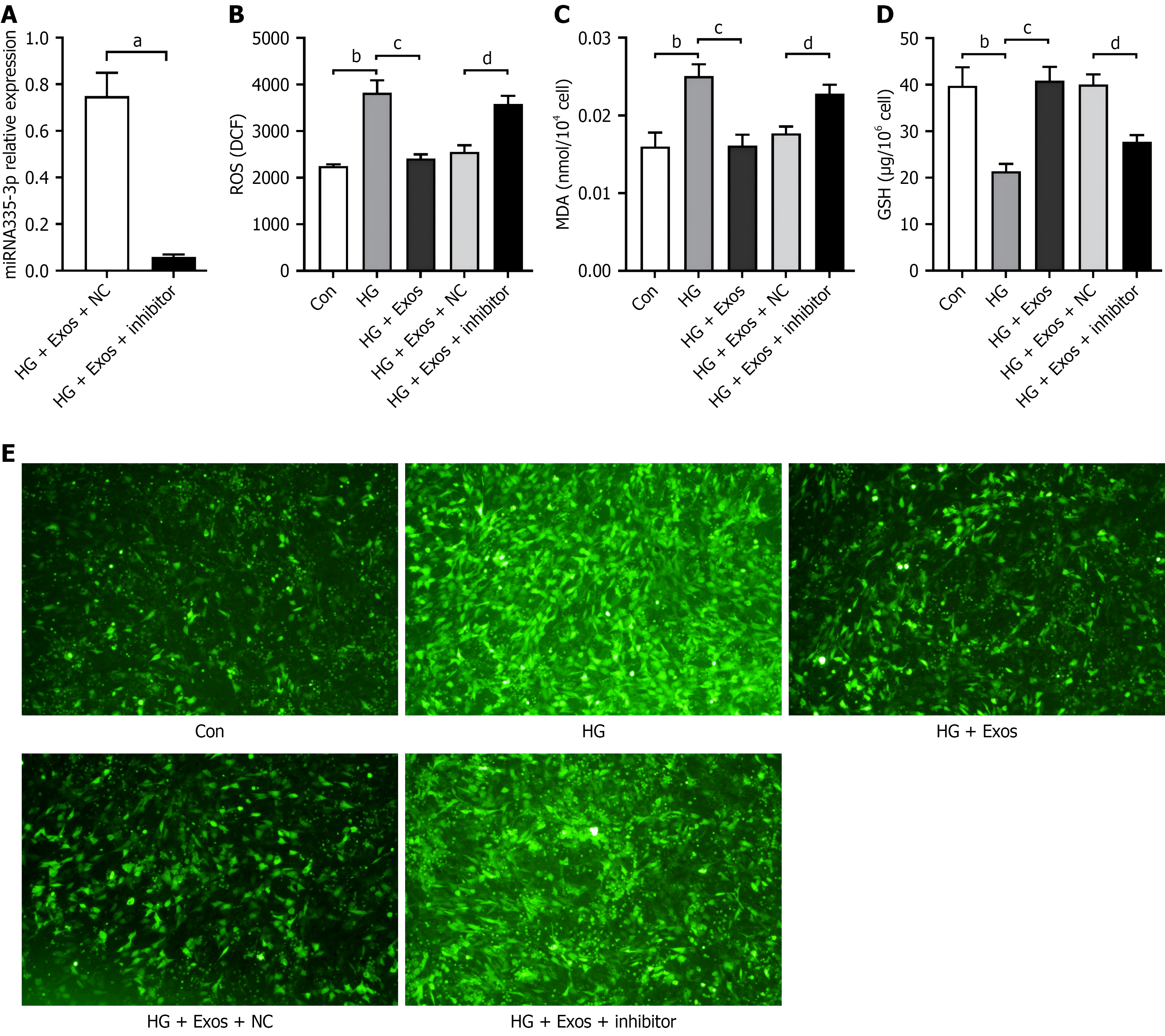 A: Detection of microRNA-335-3p levels in osteoblasts induced by high glucose after inhibition of microRNA-335-3p by reverse trans cription-quantitative polymerase chain reaction; B-D: Results of reactive oxygen species, malondialdehyde and glutathione quantitative analysis; E: Detection of cellular reactive oxygen species levels in each group using dichlorofluorescein fluorescence probe. The bars indicate the mean ± SD from three independent experiments (n = 3). aP < 0.05 vs control, bP < 0.01 vs control, cP < 0.01 vs high glucose, dP < 0.01 vs high glucose + exosomes + negative control. Con: Osteoblasts treated with normal glucose; HG: Osteoblasts treated with high glucose; HG + Exos: High glucose + endothelial cell-exosomes; HG + Exos + NC: High glucose + negative control transfection + endothelial cell-exosomes; HG + Exos + inhibitor: High glucose + microRNA-335-3p inhibitor + endothelial cell-exosomes.