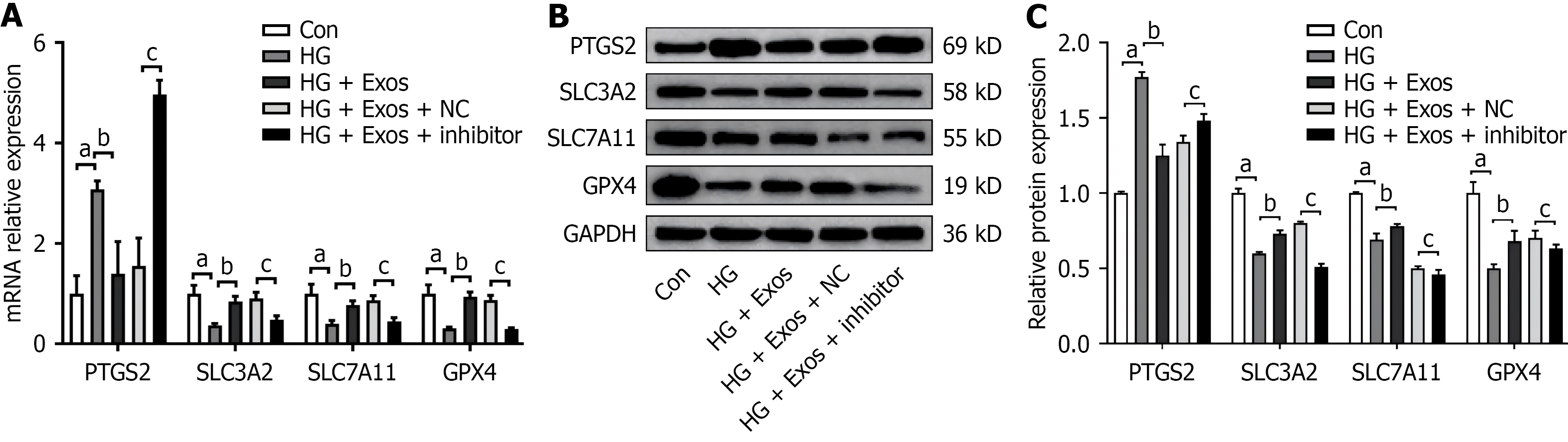 A: The relative expression levels of mRNA for prostaglandin endoperoxide synthase 2 (PTGS2), glutathione peroxidase 4 (GPX4), solute carrier family 7 member 11 (SLC7A11), and solute carrier family 3 member 2 (SLC3A2) in each group of cells; B: Western blotting to detect the protein expressions of key ferroptosis markers PTGS2, GPX4, SLC7A11, SLC3A2; C: The relative protein expressions of PTGS2, GPX4, SLC7A11, SLC3A2. The bars indicate the mean ± SD from three independent experiments (n = 3). aP < 0.01 vs control, bP < 0.01 vs high glucose, cP < 0.01 vs high glucose + exosomes + negative control. Con: Osteoblasts treated with normal glucose; HG: Osteoblasts treated with high glucose; HG + Exos: High glucose + endothelial cell-exosomes; HG + Exos + NC: High glucose + negative control transfection + endothelial cell-exosomes; HG + Exos + inhibitor: High glucose + microRNA-335-3p inhibitor + endothelial cell-exosomes; PTGS2: Prostaglandin endoperoxide synthase 2; SLC3A2: Solute carrier family 3 member 2; SLC7A11: Solute carrier family 7 member 11; GPX4: Glutathione peroxidase 4; GAPDH: Glyceraldehyde 3-phosphate dehydrogenase.