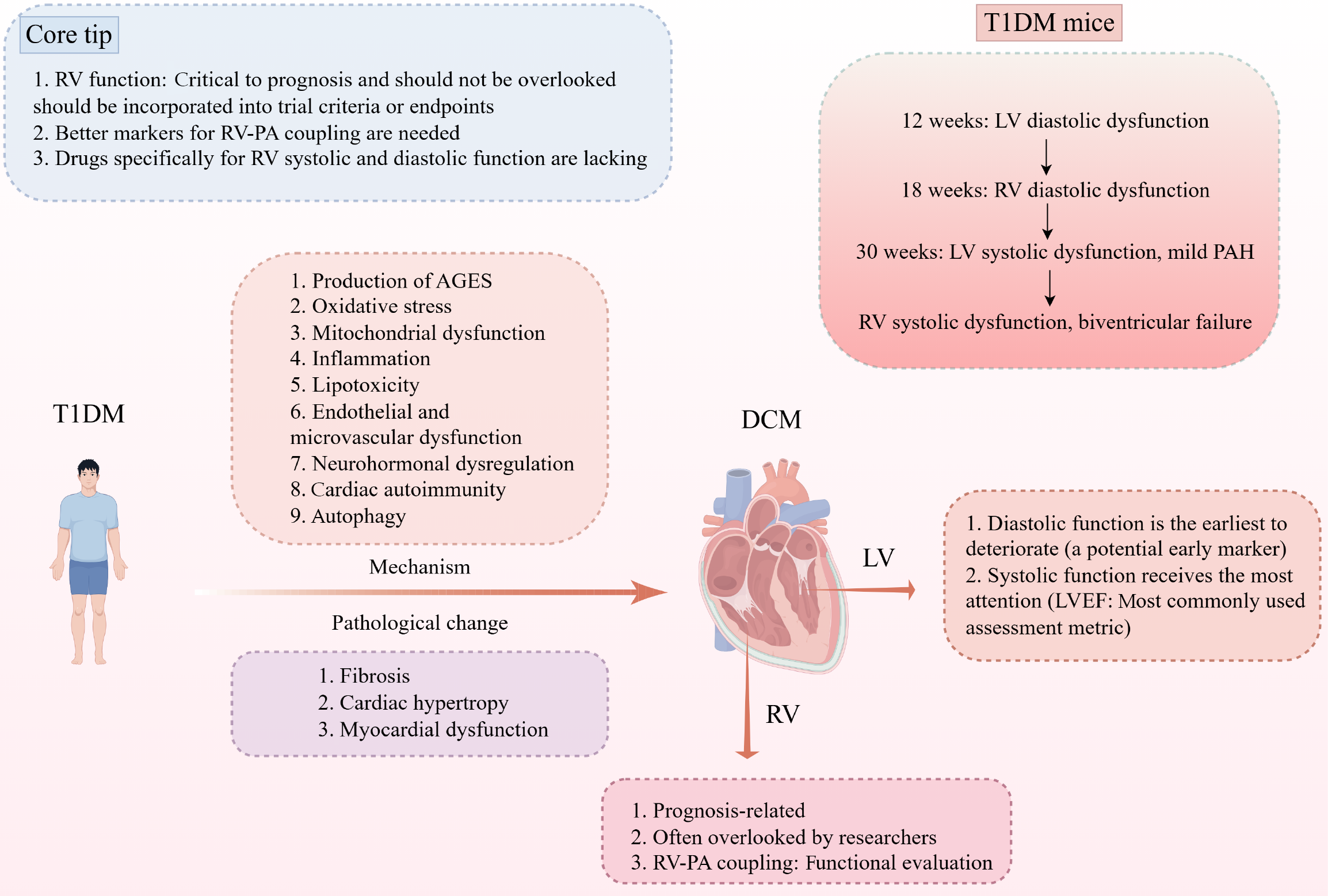 Type 1 diabetes mellitus drives diabetic cardiomyopathy via pathways such as advanced glycation end products production, oxidative stress, and mitochondrial dysfunction. Pathological changes involve fibrosis, cardiac hypertrophy, and myocardial dysfunction. In diabetic cardiomyopathy: Left ventricle diastolic function deteriorates earliest (a potential early marker), while systolic function is most heavily studied (with left ventricular ejection fraction, as the most common assessment metric). Right ventricle (RV) is prognosis-relevant but often overlooked, and RV-pulmonary artery coupling requires functional evaluation. We emphasize three points: RV function’s critical role in prognosis (and need for inclusion in trial criteria/endpoints), the necessity for improved RV-pulmonary artery coupling markers, and the lack of drugs specifically targeting RV systolic/diastolic function. RV: Right ventricle; PA: Pulmonary artery; T1DM: Type 1 diabetes mellitus; AGEs: Advanced glycation end products; DCM: Diabetic cardiomyopathy; LV: Left ventricle; LVEF: Left ventricular ejection fraction; PAH: Pulmonary arterial hypertension.