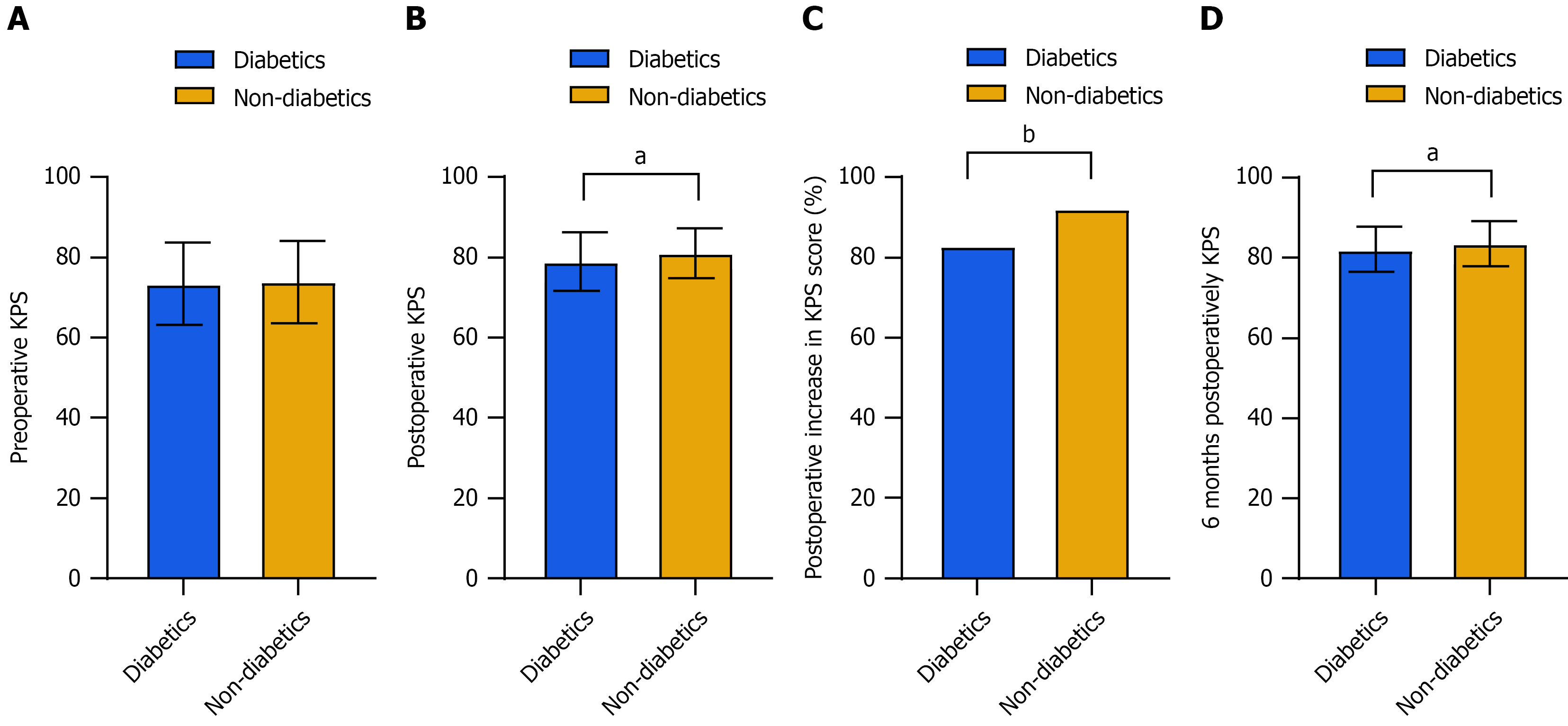 A: Preoperative Karnofsky Performance Status (KPS); B: Postoperative KPS; C: Postoperative increase in KPS scores; D: 6 months postoperatively KPS. aP < 0.05, bP < 0.01. KPS: Karnofsky Performance Status.