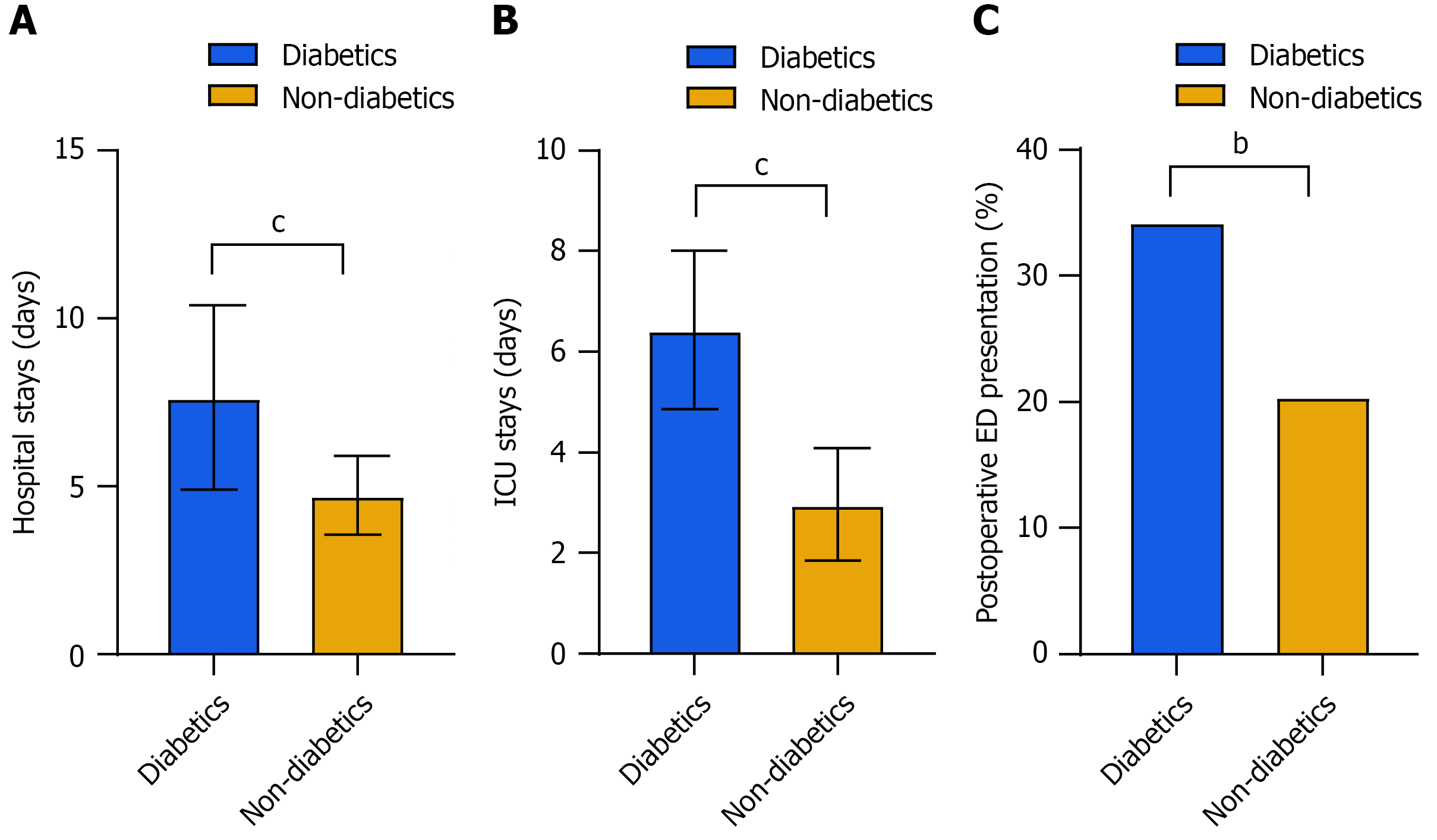 A: Hospital stays; B: Intensive care unit stays; C: Postoperative emergency department presentation. bP < 0.01, cP < 0.001. ED: Emergency department; ICU: Intensive care unit.