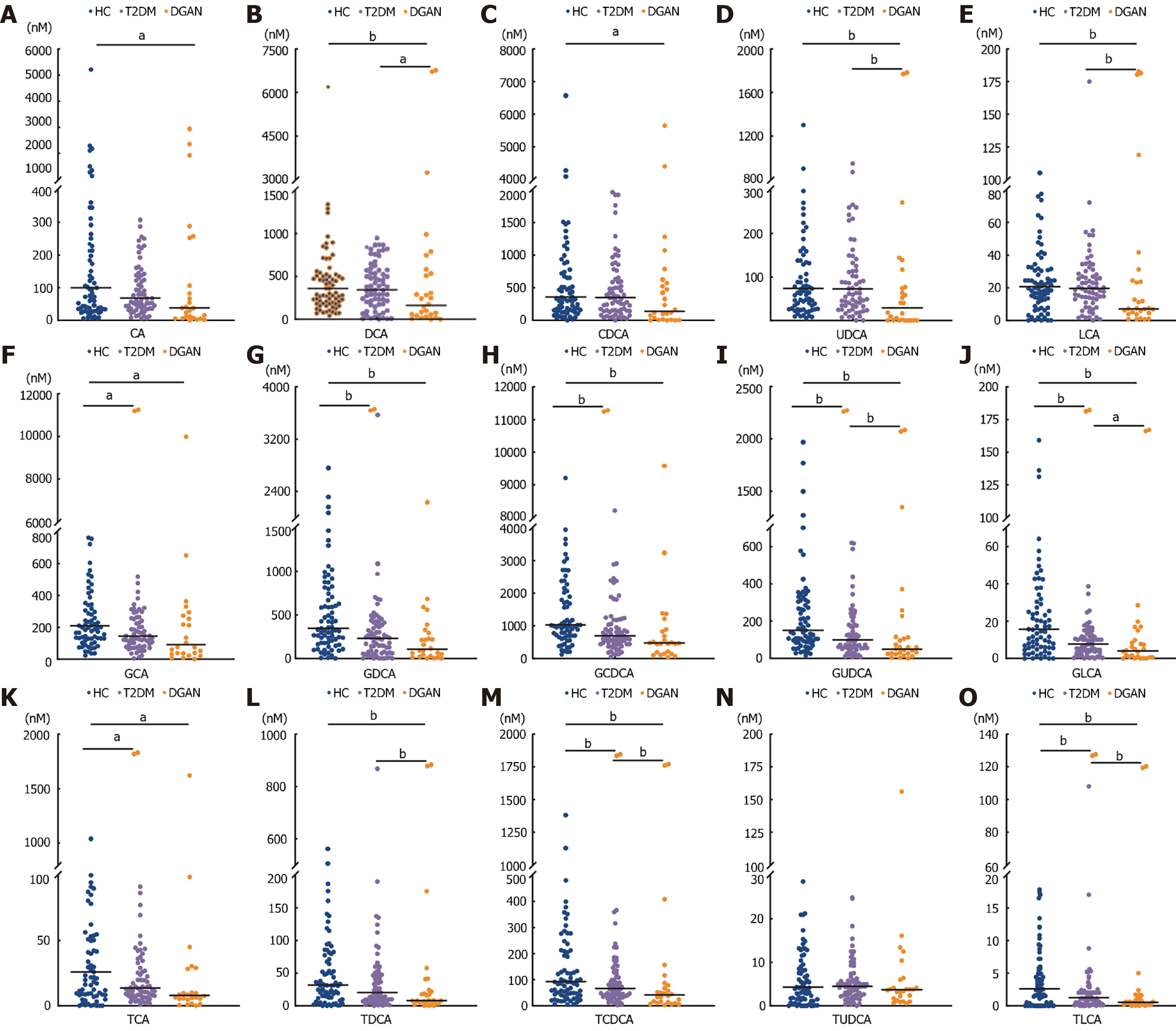 A: Cholic acid; B: Deoxycholic acid; C: Chenodeoxycholic acid; D: Ursodeoxycholic acid; E: Lithocholic acid; F: Glycocholic acid; G: Glycodeoxycholic acid; H: Glycochenodeoxycholic acid; I: Glycoursodeoxycholic acid; J: Glycolithocholic acid; K: Taurocholic acid; L: Taurodeoxycholic acid; M: Taurochenodeoxycholic acid; N: Tauroursodeoxycholic acid; O: Taurolithocholic acid. Data are presented as the median (interquartile range), and significant difference was assessed using Wilcoxon’s rank sum test. aP < 0.05; bP < 0.01. T2DM: Type 2 diabetes mellitus; HC: Healthy control; DGAN: Diabetic gastric autonomic neuropathy; CA: Cholic acid; DCA: Deoxycholic acid; CDCA: Chenodeoxycholic acid; UDCA: Ursodeoxycholic acid; LCA: Lithocholic acid; GCA: Glycocholic acid; GDCA: Glycodeoxycholic acid; GCDCA: Glycochenodeoxycholic acid; GUDCA: Glycoursodeoxycholic acid; GLCA: Glycolithocholic acid; TCA: Taurocholic acid; TDCA: Taurodeoxycholic acid; TCDCA: Taurochenodeoxycholic acid; TUDCA: Tauroursodeoxycholic acid; TLCA: Taurolithocholic acid.