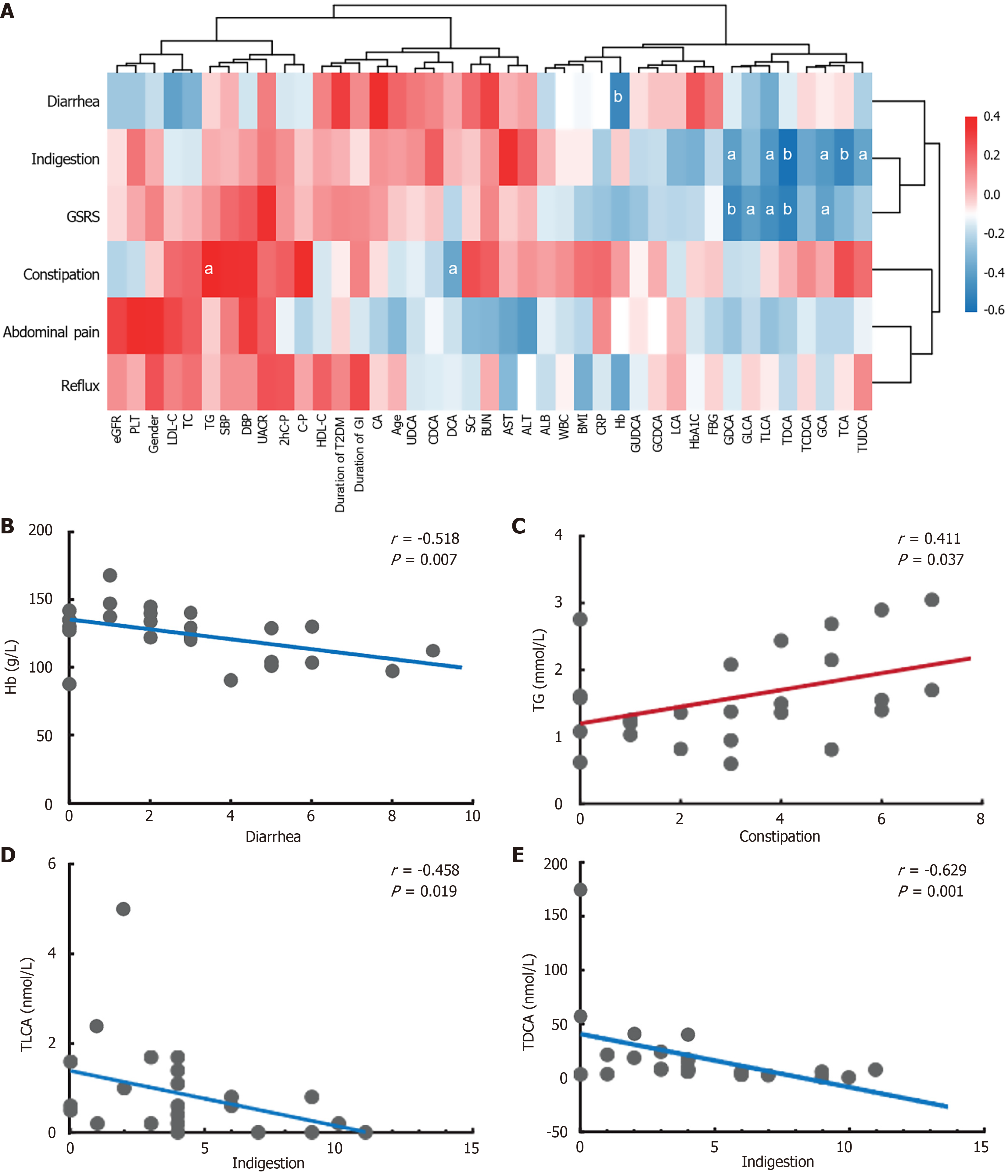A: Correlations among clinical indicators, bile acid levels, and Gastrointestinal Symptom Rating Scale scores in the type 2 diabetes mellitus and diabetic gastric autonomic neuropathy groups; B-E: Scatter plots depicting the correlations among clinical indicators, bile acids, and the scores of gastrointestinal symptoms. aP < 0.05; bP < 0.01. GSRS: Gastrointestinal Symptom Rating Scale; eGFR: Estimated glomerular filtration rate; PLT: Platelets; LDL-C: Low-density lipoprotein cholesterol; TC: Total cholesterol; TG: Triglycerides; SBP: Systolic blood pressure; DBP: Diastolic blood pressure; UACR: Urinary albumin-to-creatinine ratio; 2hC-P: 2-hour c-peptide; C-P: C-peptide; HDL-C: High-density lipoprotein cholesterol; T2DM: Type 2 diabetes mellitus; GI: Gastrointestinal; CA: Cholic acid; UDCA: Ursodeoxycholic acid; CDCA: Chenodeoxycholic acid; DCA: Deoxycholic acid; SCr: Serum creatinine; BUN: Blood urea nitrogen; AST: Aspartate aminotransferase; ALT: Alanine aminotransferase; ALB: Albumin; BMI: Body mass index; CRP: C-reactive protein; Hb: Hemoglobin; GUDCA: Glycoursodeoxycholic acid; GCDCA: Glycochenodeoxycholic acid; LCA: Lithocholic acid; HbA1c: Hemoglobin a1c; FBG: Fasting blood glucose; GDCA: Glycodeoxycholic acid; GLCA: Glycolithocholic acid; TLCA: Taurolithocholic acid; TDCA: Taurodeoxycholic acid; TCDCA: Taurochenodeoxycholic acid; GCA: Glycocholic acid; TCA: Taurocholic acid; TUDCA: Tauroursodeoxycholic acid.