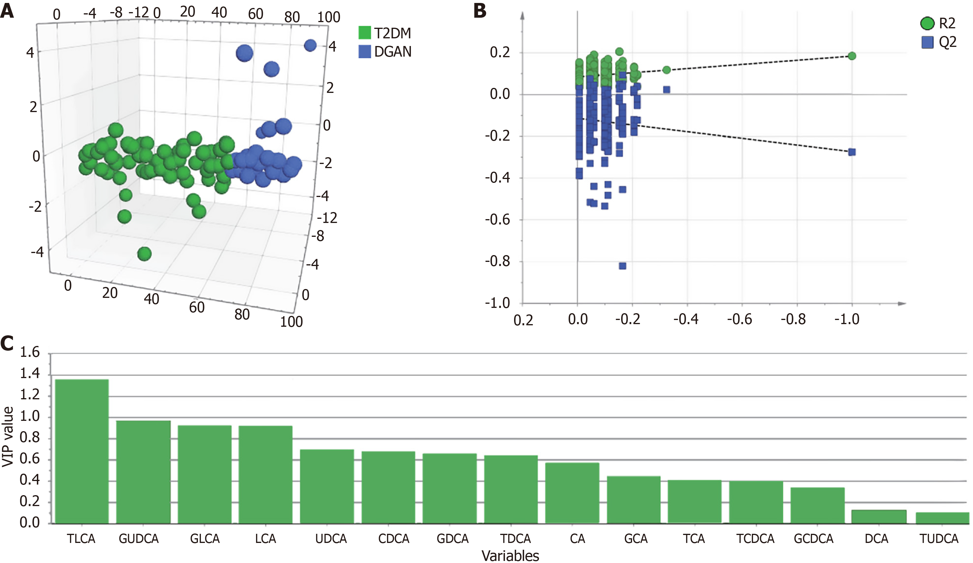 A: Orthogonal partial least squares discriminant analysis three-dimensional model between uncomplicated type 2 diabetes mellitus and diabetic gastric autonomic neuropathy. R2X = 0.406, R2Y = 0.183, and Q2Y = -0.274; B: The permutation test demonstrated no overfitting in the orthogonal partial least squares discriminant analysis model [Q2 = (0, -0.386), R2 = (0, 0.152)]; C: The contribution of the metabolites distinguishing uncomplicated type 2 diabetes mellitus from diabetic gastric autonomic neuropathy as indicated by variable importance in projection values. T2DM: Type 2 diabetes mellitus; DGAN: Diabetic gastric autonomic neuropathy; TLCA: Taurolithocholic acid; GUDCA: Glycoursodeoxycholic acid; GLCA: Glycolithocholic acid; LCA: Lithocholic acid; UDCA: Ursodeoxycholic acid; CDCA: Chenodeoxycholic acid; GDCA: Glycodeoxycholic acid; TDCA: Taurodeoxycholic acid; CA: Cholic acid; GCA: Glycocholic acid; TCA: Taurocholic acid; TCDCA: Taurochenodeoxycholic acid; GCDCA: Glycochenodeoxycholic acid; DCA: Deoxycholic acid; TUDCA: Tauroursodeoxycholic acid.