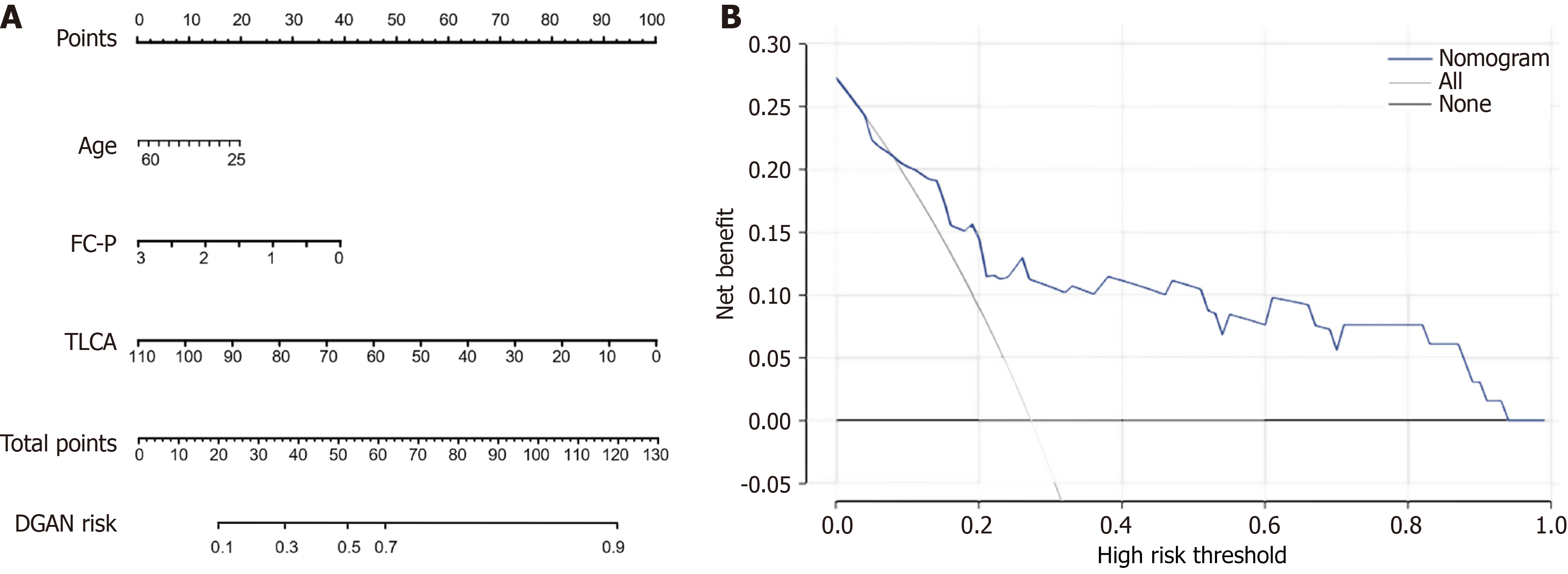 A: The nomogram includes age, fasting C-peptide, and taurolithocholic acid along with their corresponding points and total risk scores; B: Decision curve analysis was performed to evaluate the clinical net benefit across different risk thresholds. TLCA: Taurolithocholic acid; FC-P: Fasting C-peptide; DGAN: Diabetic gastric autonomic neuropathy.