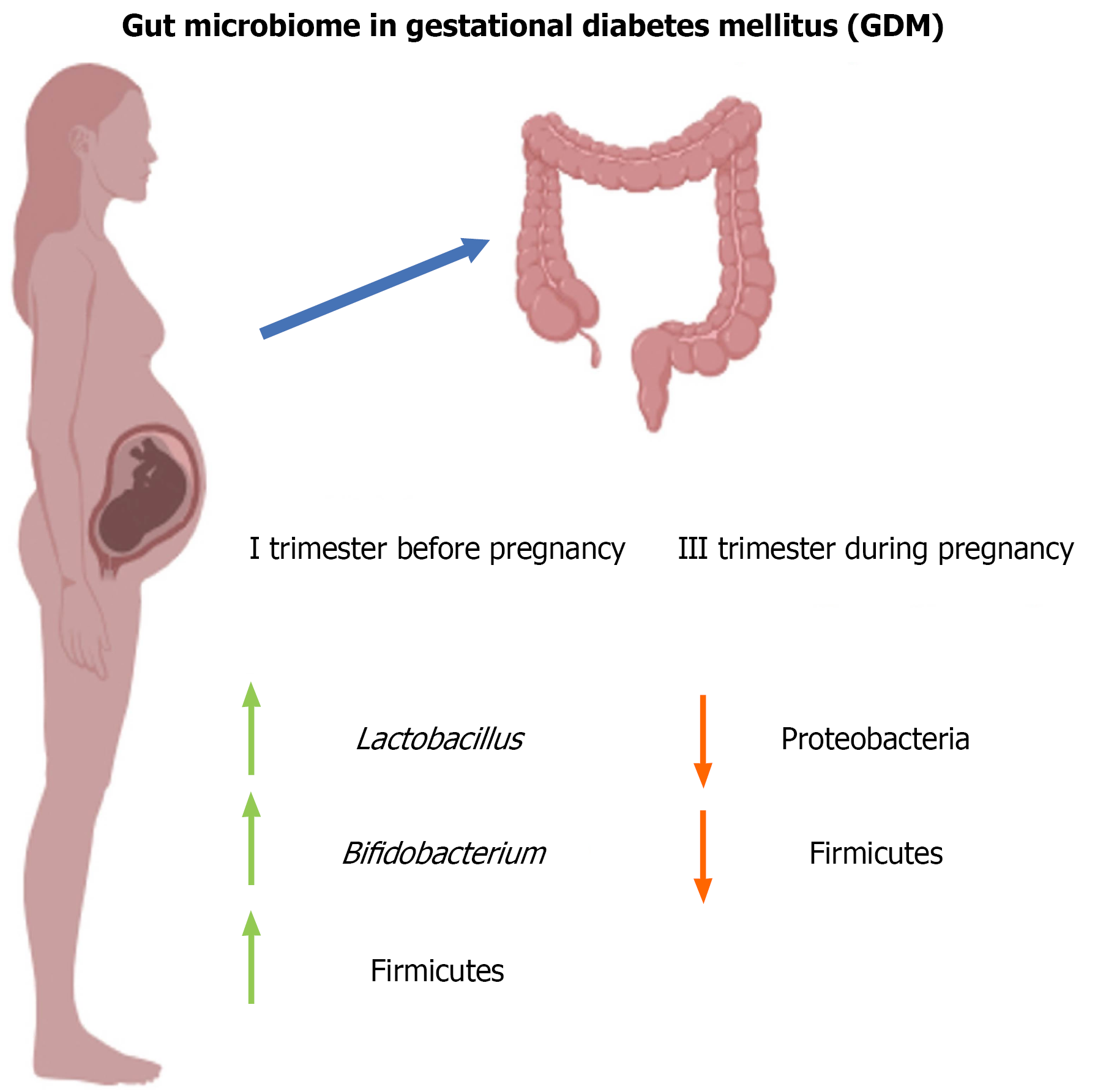 Typical changes in gut microbiota composition before and during pregnancy. It shows a normal, healthy microbiome with a balance of beneficial bacteria (e.g., Lactobacillus, Bifidobacterium) and a more diverse microbial community, contrasted with a dysbiotic microbiome in pregnant women with gestational diabetes. GDM: Gestational diabetes mellitus.