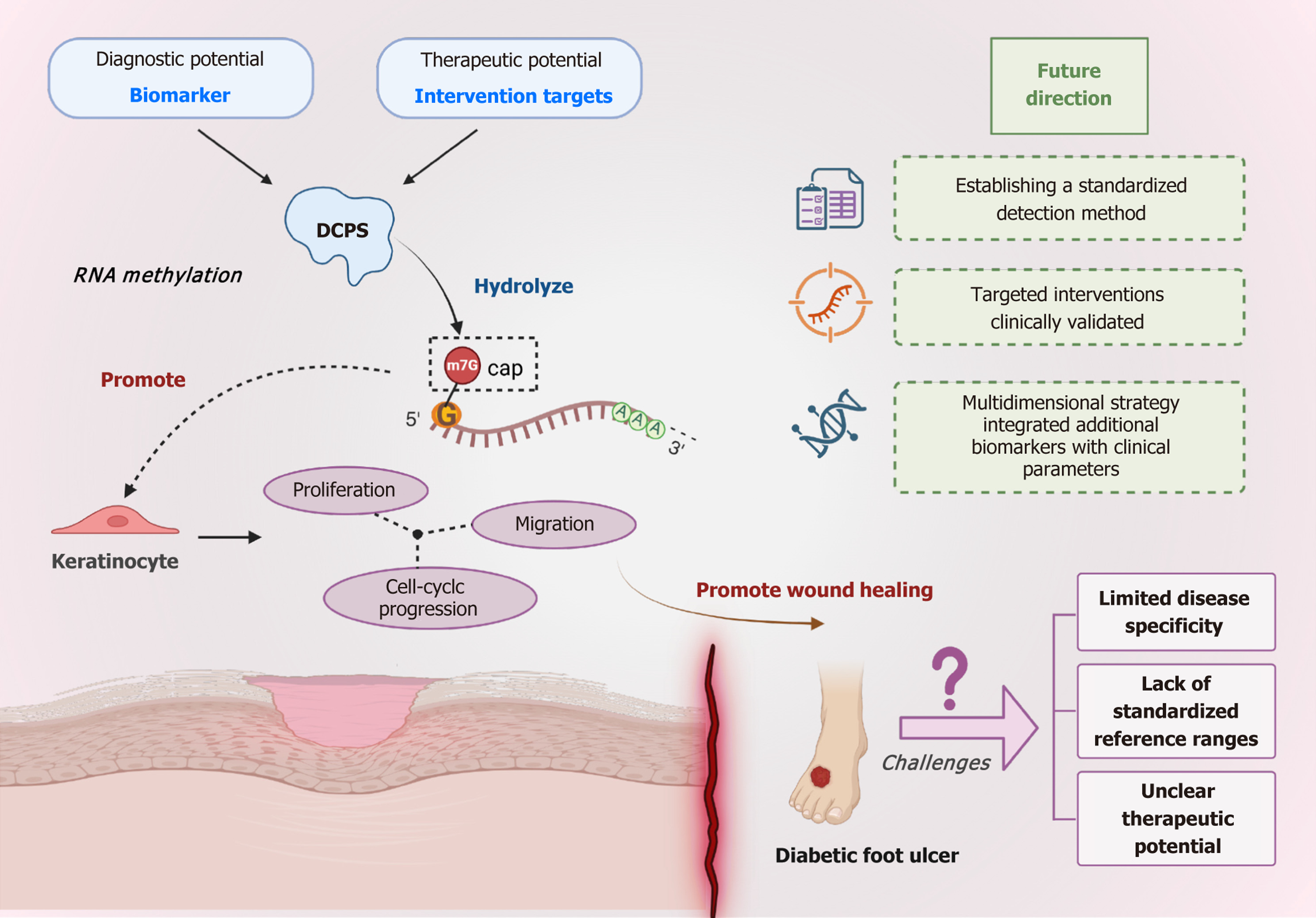 Decapping scavenger enzyme (DCPS), a key regulator in N7-methylguanosine RNA metabolism, has emerged as a promising biomarker and therapeutic target for diabetic foot ulcer (DFU). Reduced DCPS expression impairs keratinocyte proliferation, migration, and cell-cycle progression, directly linking RNA methylation to dysfunctional wound repair. However, the clinical translation of DCPS faces significant hurdles, including limited disease specificity due to variable expression in patients with metabolic or inflammatory comorbidities, a lack of standardized detection methods and reference ranges for reliable quantification, and uncertain in vivo therapeutic efficacy of DCPS modulation. This figure highlights the necessity of developing multi-faceted strategies that integrate DCPS with other clinical parameters and molecular biomarkers to enhance diagnostic accuracy and therapeutic potential. Future research must focus on establishing standardized assays, elucidating DCPS regulatory mechanisms, and validating targeted interventions through robust preclinical and clinical studies to advance its application in personalized DFU management. DCPS: Decapping scavenger enzyme; m7G: N7-methylguanosine. Created in BioRender (Supplementary material).