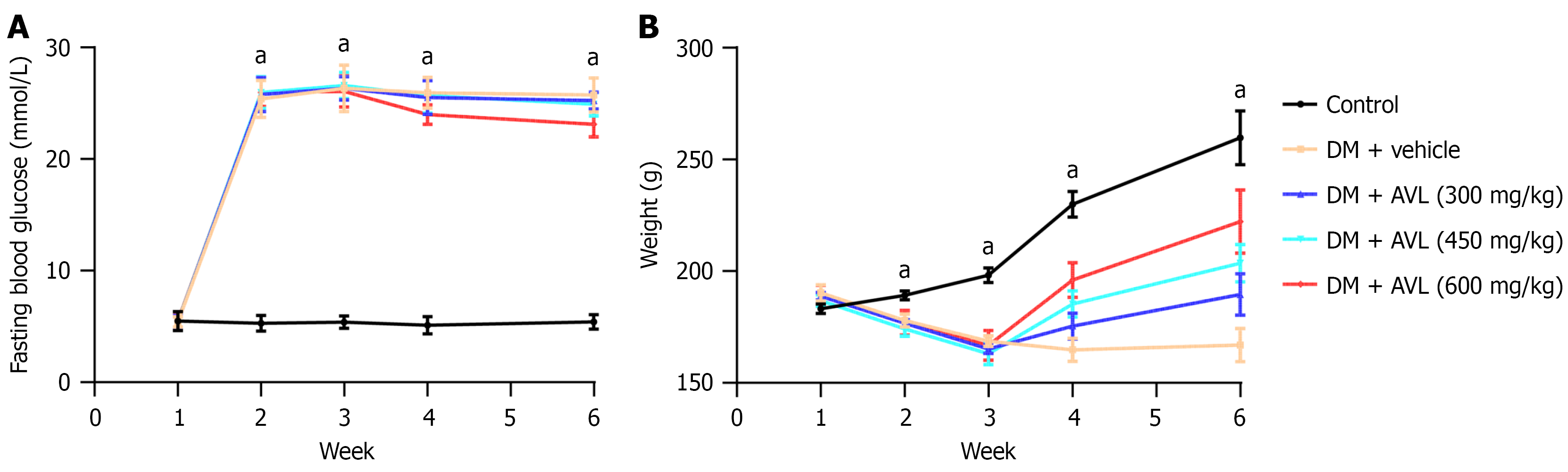 treatment counteracted hyperglycemia and weight loss in diabetic rats. A type 1 diabetic rat model was established by intraperitoneal injection of 60 mg/kg streptozotocin for seven consecutive days in week 1, and the control group was injected with an equal volume of sterile saline. Starting from week 2, Amomum villosum Lour. (AVL) was administered intraperitoneally once daily until the end of the experiment. The total study duration was 5 weeks. Blood glucose and body weight were recorded regularly. A: Blood glucose level; B: Rat body weight. aP < 0.05 diabetes mellitus (DM) + vehicle group vs control group.