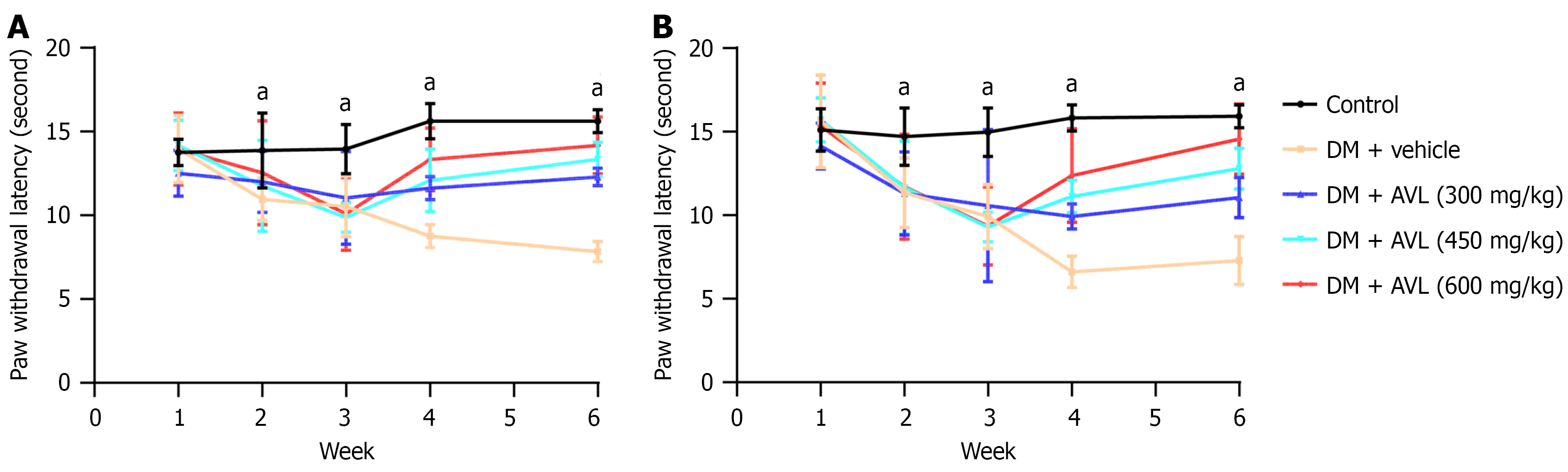 had higher mechanical and thermal pain thresholds. A: Mechanical sensitivity of rats was assessed by stimulating with von Frey nylon filaments, with the withdrawal response of the paw being observed; B: Thermal sensitivity was assessed using the hot plate method, with paw withdrawal latency serving as the indicator of thermal pain threshold. aP < 0.05 diabetes mellitus (DM) + vehicle group vs control group. AVL: Amomum villosum Lour.