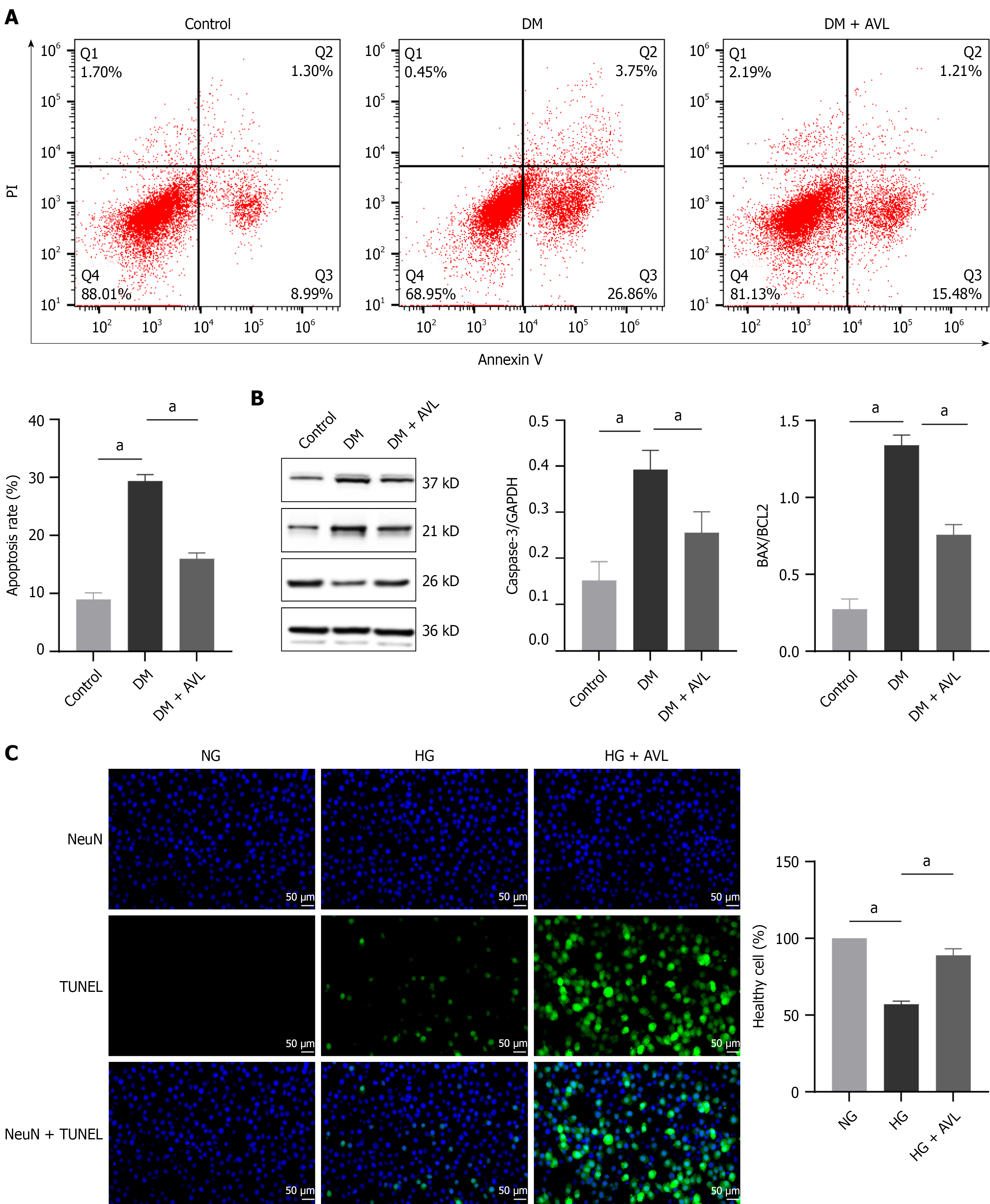 treatment reduced the apoptosis of dorsal root ganglion neurons induced by hyperglycemia in vivo and in vitro. A: Apoptosis levels in rat dorsal root ganglion (DRG) tissue were analyzed by flow cytometry; B: Protein expression levels of caspase-3, B-cell lymphoma 2 (Bcl-2)-associated X protein (BAX), and Bcl-2 in rat DRG tissue were detected by Western blotting; C: Primary DRG neurons were pre-treated with 5.5 mmol/L and 50 mmol/L glucose for 24 hours, and Amomum villosum Lour. (AVL) treatment was added in the last 12 hours. Primary cultured DRG neurons were labeled with terminal deoxynucleotidyl transferase-mediated dUTP nick-end labeling (TUNEL) (green) and nuclei were labeled with neuronal nuclei (NeuN) (blue) on the left, and the right figure shows the percentage of healthy neurons (non-apoptotic). aP < 0.05. DM: Diabetes mellitus; HG: High glucose; NG: Normal glucose; PI: Propidium Iodide.