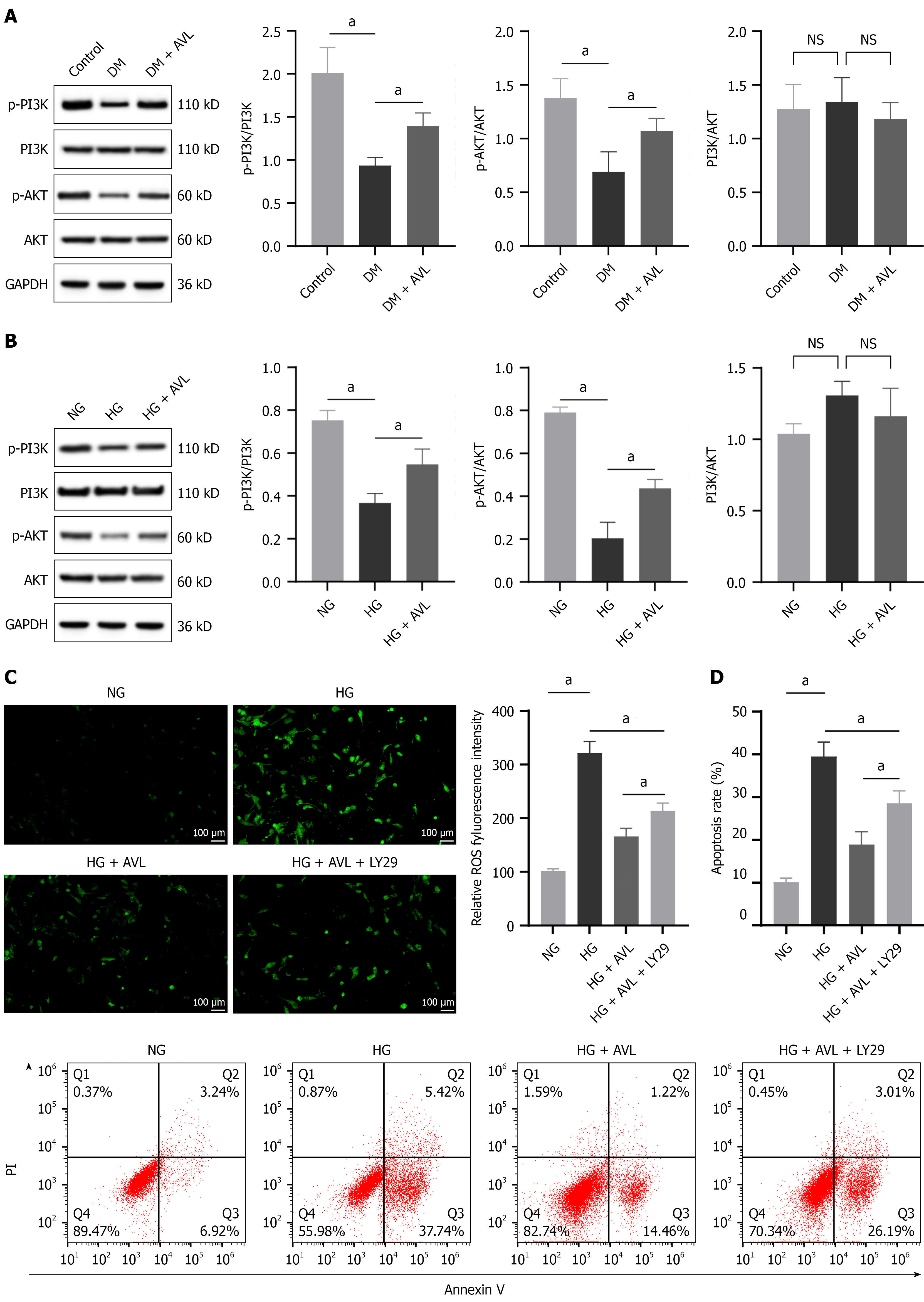 treatment inhibited oxidative stress and apoptosis in the dorsal root ganglion of diabetic rats by activating the phosphoinositide 3-kinase/AKT signaling pathway. A: Protein levels of phosphorylated phosphoinositide 3-kinase (p-PI3K) and phosphorylated AKT (p-AKT) in dorsal root ganglion (DRG) were analyzed by Western blotting; B: Protein levels of p-PI3K and p-AKT in primary DRG neurons were analyzed by Western blotting; C: Primary DRG neurons were pre-treated with 0.5 μM LY294002 for 2 hours, and then incubated with high glucose (HG) and Amomum villosum Lour. (AVL). The reactive oxygen species levels in primary DRG neurons were analyzed by immunofluorescence; D: Apoptosis proportion of primary DRG neurons was analyzed by flow cytometry. aP < 0.05; DM: Diabetes mellitus; NG: Normal glucose; NS: Not significant; PI: Propidium iodide.