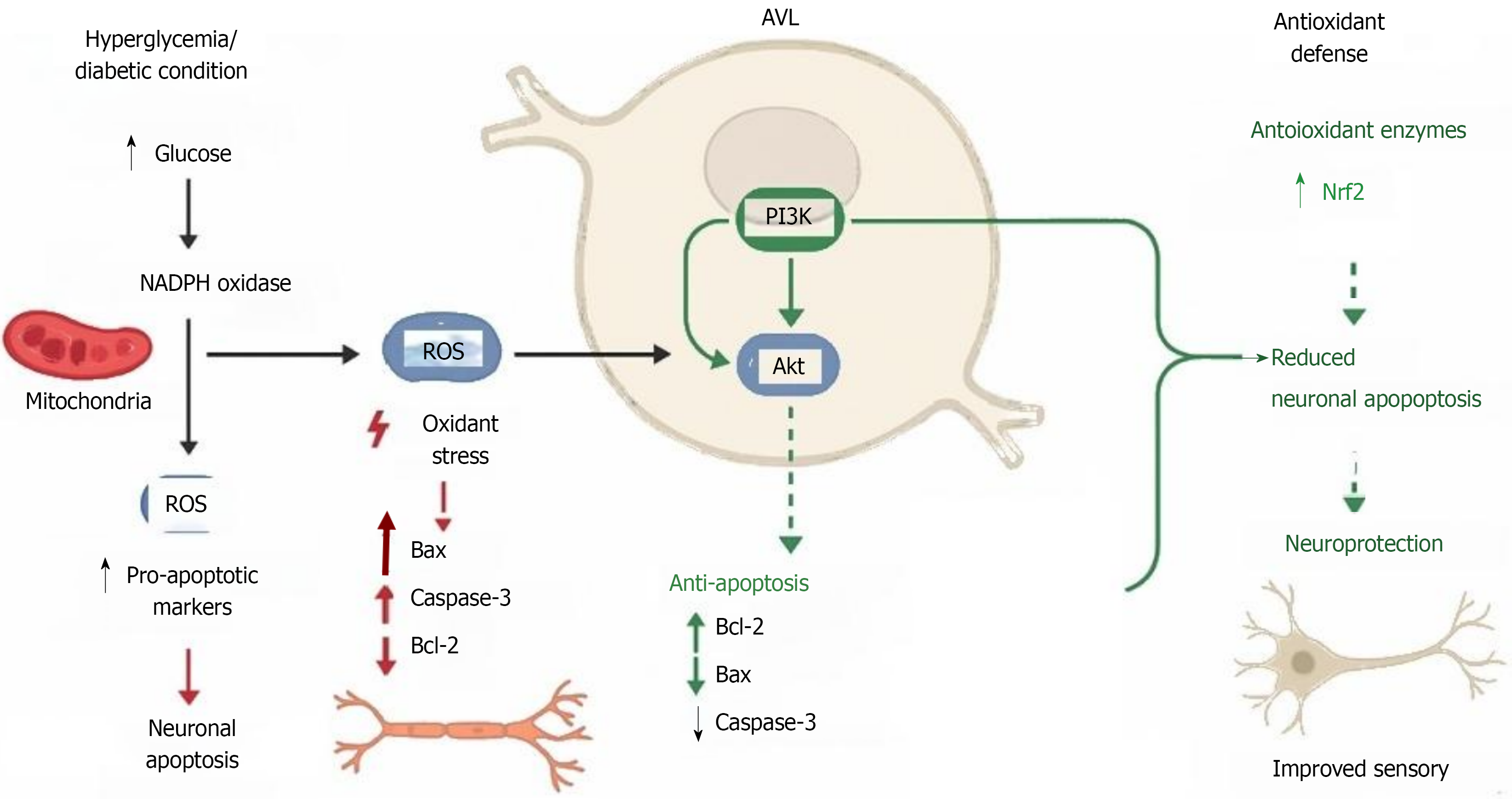 ’s mechanism in alleviating diabetic peripheral neuropathy. Under hyperglycemic/diabetic conditions, excessive reactive oxygen species (ROS) generation induces oxidative stress, triggering neuronal apoptosis and subsequently leading to neuronal injury and sensory dysfunction (red arrows). Amomum villosum Lour. (AVL) activates the phosphoinositide 3-kinase (PI3K)/AKT signaling pathway, thereby upregulating nuclear factor erythroid 2-related factor 2-mediated antioxidant defense and cell survival factors like B-cell lymphoma 2 (Bcl-2). This action inhibits ROS accumulation and neuronal apoptosis, alleviating diabetes-induced neural damage (green arrows).