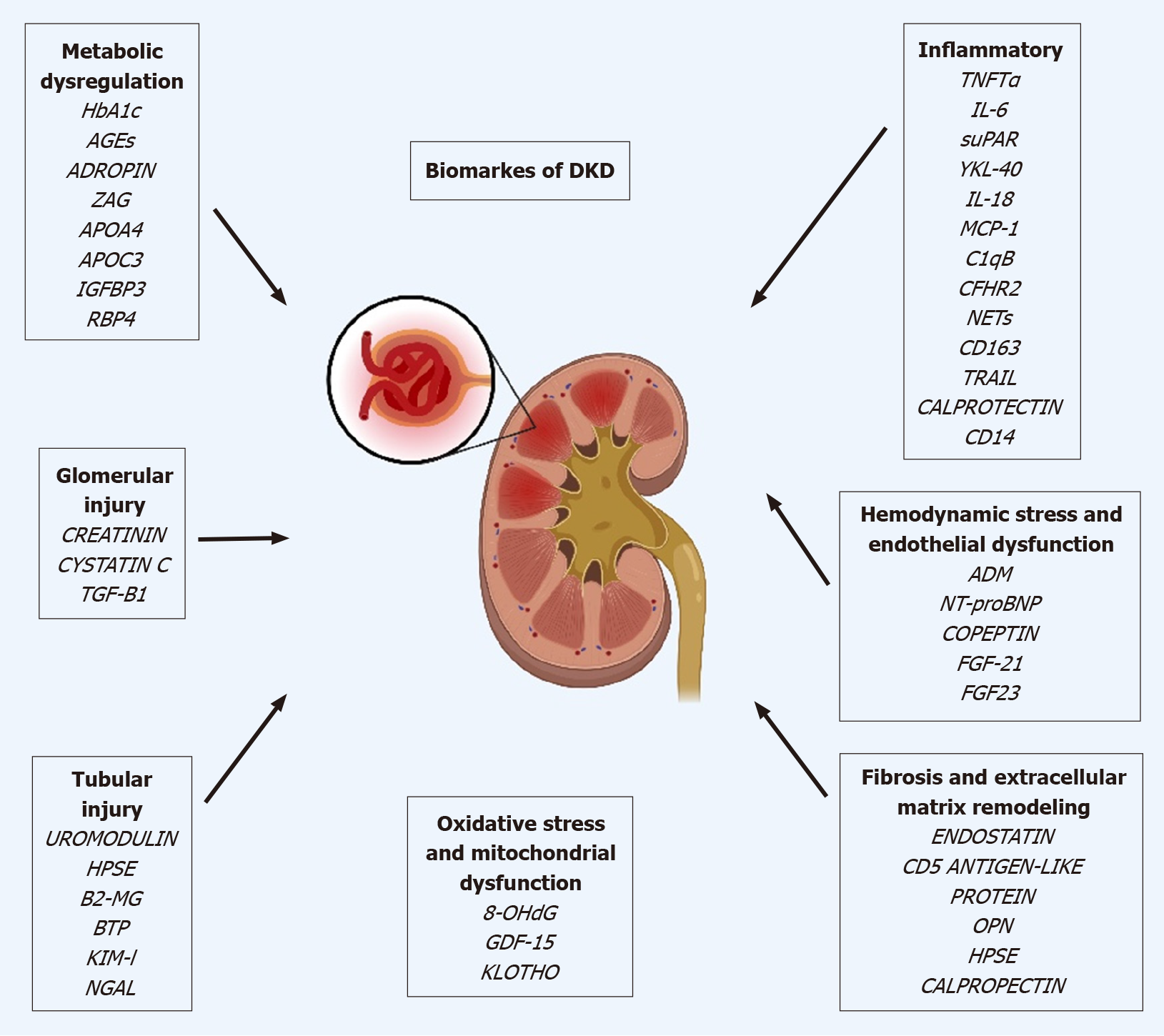 The central kidney illustration shows the anatomical context of these pathological processes. DKD: Diabetic kidney disease; HbA1c: Glycosylated hemoglobin; AGEs: Advanced glycation end products; ZAG: Zinc-alpha-2-glycoprotein; APOA4: Apolipoprotein A-IV; APOC3: Apolipoprotein C-III; IGFBP3: Insulin-like growth factor binding protein 3; RBP4: Retinol-binding protein 4; TGF-β1: Transforming growth factor beta 1; HPSE: Heparanase; β2-MG: Beta 2-microglobulin; BTP: Beta-trace protein; KIM-1: Kidney injury molecule-1; NGAL: Neutrophil gelatinase-associated lipocalin; 8-OHdG: 8-hydroxydeoxyguanosine; GDF-15: Growth differentiation factor-15; TNF-α: Tumor necrosis factor-alpha; IL: Interleukin; suPAR: Soluble urokinase plasminogen activator receptor; YKL-40: Chitinase-3-like protein 1; MCP-1: Monocyte chemoattractant protein 1; C1QB: C1q subcomponent subunit B; CFHR2: Complement factor H-related protein 2; NETs: Neutrophil extracellular traps; CD: Cluster of differentiation; TRAIL: Tumor necrosis factor related apoptosis inducing ligand; OPN: Osteopontin; ADM: Adrenomedullin; NT-proBNP: N-terminal pro-brain natriuretic peptide; FGF: Fibroblast growth factor.