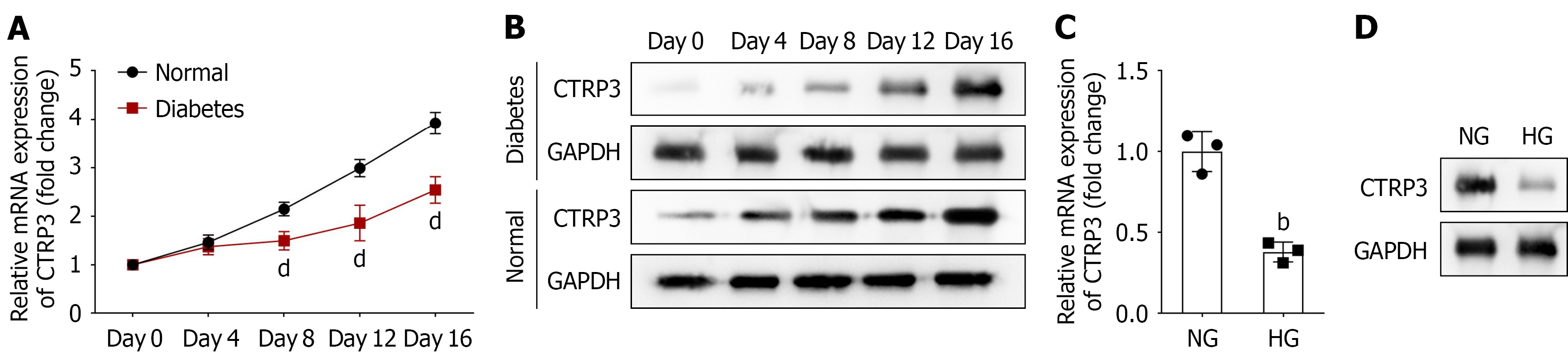 A: Quantitative polymerase chain reaction (qPCR) analysis of messenger RNA (mRNA) levels of C1q tumor necrosis factor associated protein 3 (CTRP3) in blood samples collected from normal and diabetic mice at days 0, 4, 8, 12, and 16; B: Western blot analysis of protein levels of CTRP3 in blood samples collected from normal and diabetic mice at days 0, 4, 8, 12, and 16; C: QPCR analysis of mRNA levels of CTRP3 in HaCaT cells treated with 5.6 mmol/L glucose or 30 mmol/L glucose 48 hours later; D: Western blot analysis of protein levels of CTRP3 in HaCaT cells treated with 5.6 mmol/L glucose or 30 mmol/L glucose 48 hours later. bP < 0.01 vs 5.6 mmol/L glucose group. dP < 0.0001 vs normal group. mRNA: Messenger RNA; CTRP3: C1q tumor necrosis factor associated protein 3; NG: 5.6 mmol/L glucose group; HG: 30 mmol/L glucose group; GAPDH: Glyceraldehyde-3-phosphate dehydrogenase.