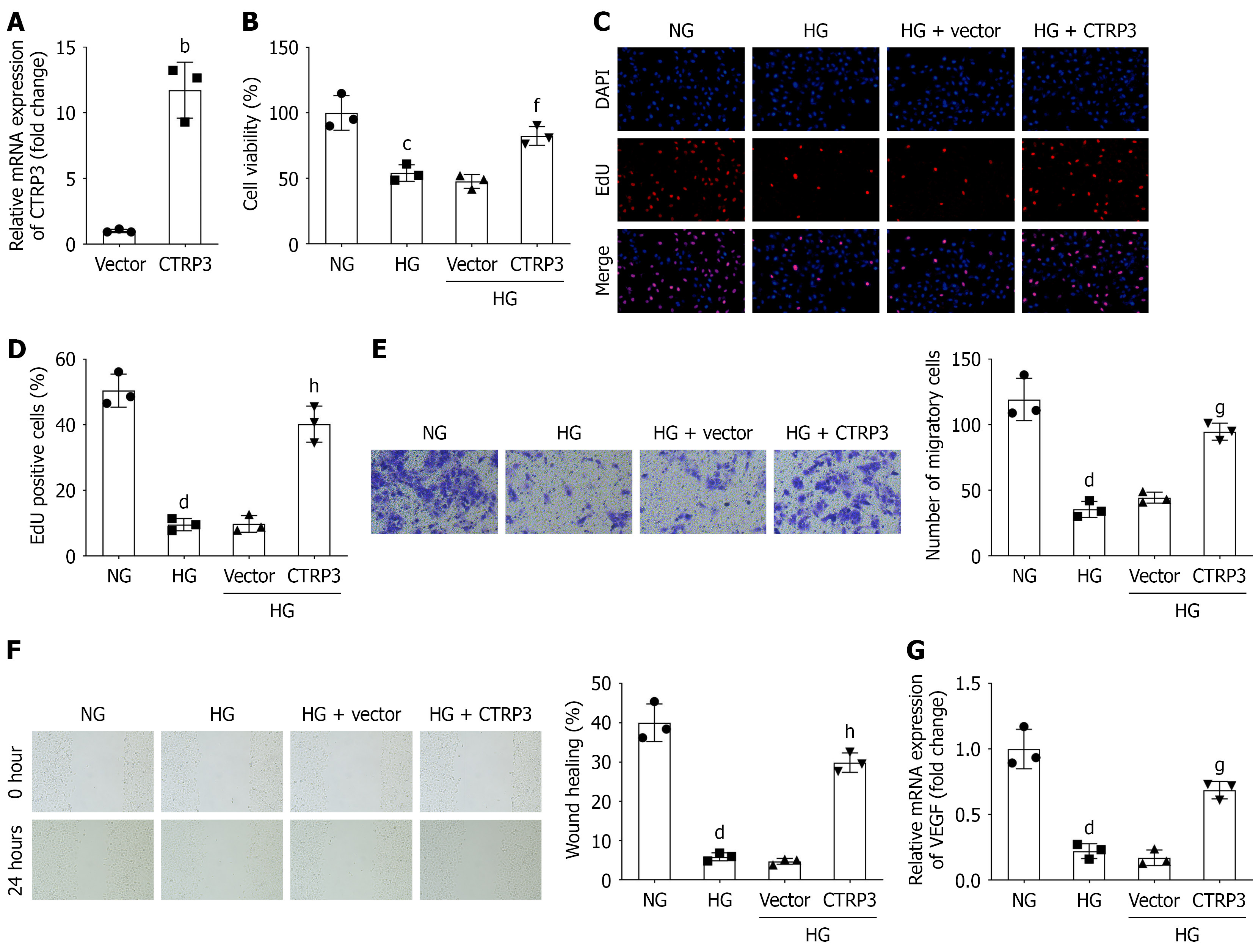 A: Quantitative polymerase chain reaction (qPCR) analysis of messenger RNA (mRNA) levels of C1q tumor necrosis factor associated protein 3 in HaCaT cells before and after transfection; B: Cell viability of HaCaT cells before and after transfection is detected by cell counting kit-8 assay; C and D: Representative images and quantitative analysis of HaCaT cells before and after transfection were measured by 5-ethynyl-2’-deoxyuridine method to obtain the cell growth; E: Cell migration of HaCaT cells before and after transfection was detected by transwell method; F: Representative images and quantitative analysis of HaCaT cells before and after transfection were measured by scratch wound healing method to obtain the cell migration; G: QPCR analysis of mRNA levels of vascular endothelial growth factor in HaCaT cells before and after transfection. bP < 0.01 vs vector group. cP < 0.001 vs 5.6 mmol/L glucose group. dP < 0.0001 vs 5.6 mmol/L glucose group. fP < 0.01 vs 30 mmol/L glucose + vector group. gP < 0.001 vs 30 mmol/L glucose + vector group. hP < 0.0001 vs 30 mmol/L glucose + vector group. mRNA: Messenger RNA; CTRP3: C1q tumor necrosis factor associated protein 3; NG: 5.6 mmol/L glucose group; HG: 30 mmol/L glucose group; DAPI: 4’,6-diamidino-2-phenylindole; EdU: 5-ethynyl-2’-deoxyuridine; VEGF: Vascular endothelial growth factor.