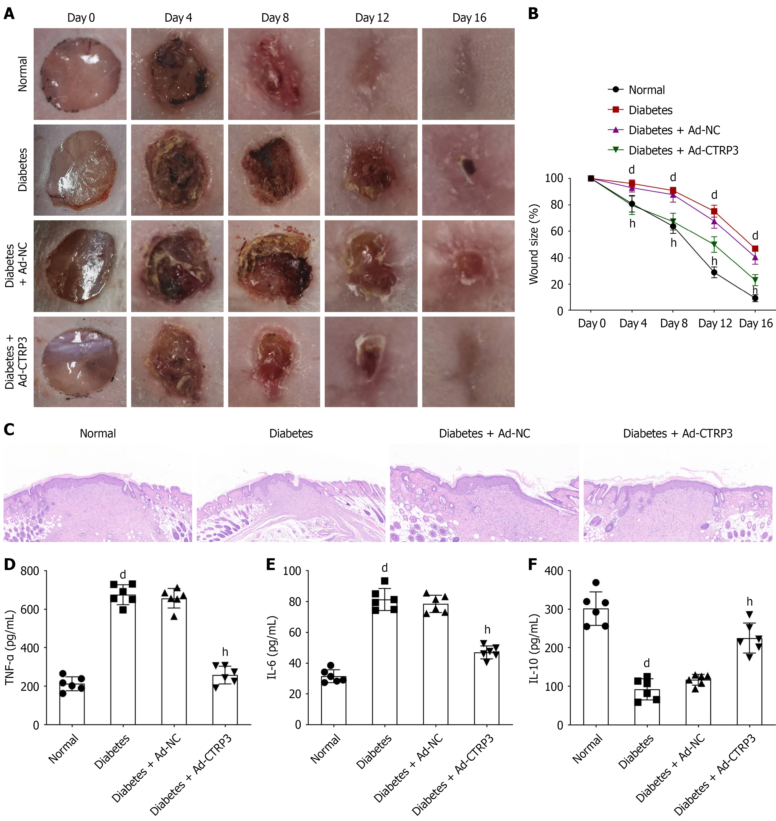 A: The representative images of wound in mice of each group; B: The quantitative analysis of wound size in mice of each group; C: The hematoxylin and eosin staining images of wound tissues in mice of each group; D-F: Serum levels of tumor necrosis factor-α, interleukin (IL)-6, and IL-10 were measured using commercially available enzyme-linked immunosorbent assay kits. dP < 0.0001 vs normal group. hP < 0.0001 vs diabetes + adenovirus-negative control group. CTRP3: C1q tumor necrosis factor associated protein 3; Ad: Adenovirus; NC: Negative control; TNF: Tumor necrosis factor; IL: Interleukin.