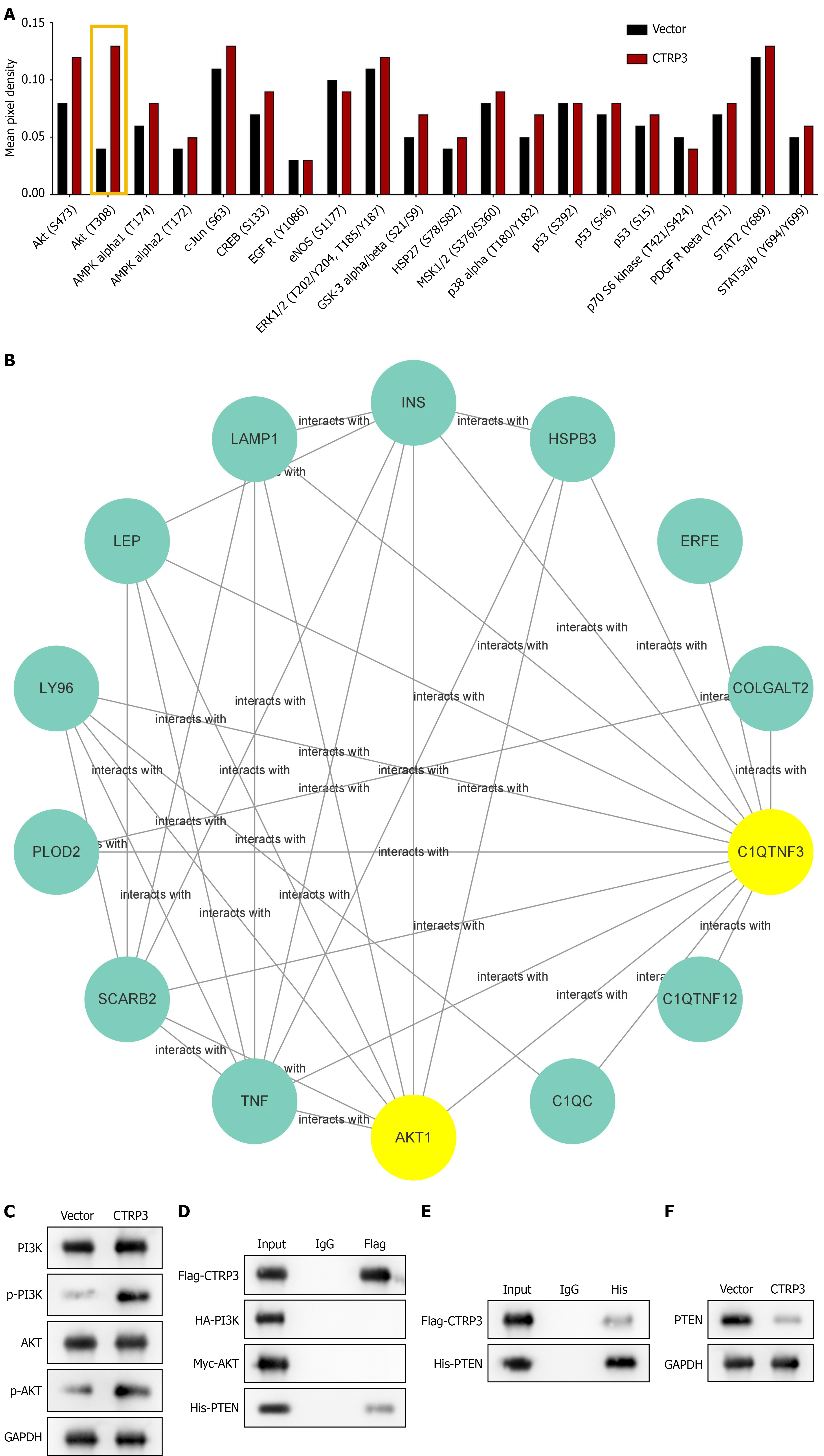 A: The cell lysates of HaCaT cells before and after transfection were analyzed using the human phospho-kinase array; B: The STRING analysis was performed to verify the interaction between C1q tumor necrosis factor associated protein 3 (CTRP3) and protein kinase B (AKT) proteins; C: Representative images of key proteins of phosphoinositide 3-kinase/AKT pathway in HaCaT cells before and after transfection; D and E: Co-immunoprecipitation analysis demonstrated the interaction between CTRP3 and AKT proteins; F: Representative images of PTEN protein in HaCaT cells transfected with overexpressed CTRP3 vector or control vector. CTRP3: C1q tumor necrosis factor associated protein 3; AKT: Protein kinase B; AMPK: Adenosine 5’-monophosphate-activated protein kinase; c-Jun: C-Jun N-terminal kinase; CREB: Cyclic-adenosine 5’-monophosphate response binding protein; EGFR: Endothelial growth factor receptor; eNOS: Endothelial nitric oxide synthase; ERK: Extracellular signal-regulated kinase; GSK: Glycogen synthase kinase; HSP: Heat shock protein; MSK: Mitogen- and stress-activated protein kinases; PDGFR: Platelet-derived growth factor receptor; STAT: Signal transducer and activator of transcription; PI3K: Phosphoinositide 3-kinase; p-PI3K: Phosphor-phosphoinositide 3-kinase; p-AKT: Phosphor-protein kinase B; GAPDH: Glyce raldehyde-3-phosphate dehydrogenase; HA: Hemagglutinin; IgG: Immunoglobulin G.