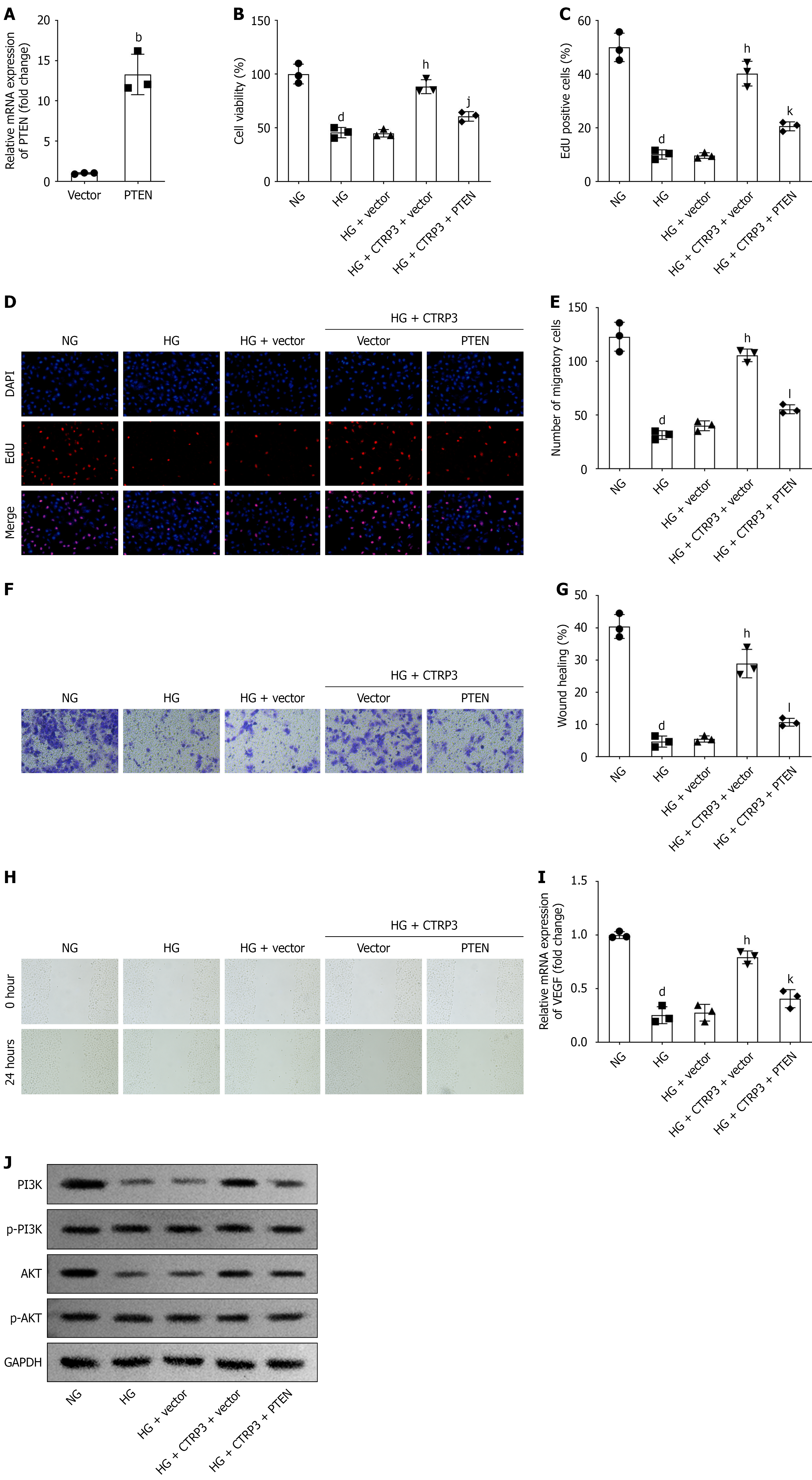 A: Quantitative polymerase chain reaction (qPCR) analysis of messenger RNA (mRNA) levels of PTEN in HaCaT cells before and after transfection; B: Cell viability of HaCaT cells before and after transfection is detected by cell counting kit-8 assay; C and D: Representative images and quantitative analysis of HaCaT cells before and after transfection were measured by 5-ethynyl-2’-deoxyuridine method to obtain the cell growth; E and F: Cell migration of HaCaT cells before and after transfection was detected by transwell method; G and H: Representative images and quantitative analysis of HaCaT cells before and after transfection were measured by scratch wound healing method to obtain the cell migration; I: QPCR analysis of mRNA levels of vascular endothelial growth factor in HaCaT cells before and after transfection; J: Representative images of key proteins of phosphoinositide 3-kinase/protein kinase B pathway in HaCaT cells before and after transfection. bP < 0.01 vs vector group. dP < 0.0001 vs 5.6 mmol/L glucose group. hP < 0.0001 vs 30 mmol/L glucose + vector group. jP < 0.01 vs 30 mmol/L glucose + C1q tumor necrosis factor associated protein 3 + vector group. kP < 0.001 vs 30 mmol/L glucose + C1q tumor necrosis factor associated protein 3 + vector group. lP < 0.0001 vs 30 mmol/L glucose + C1q tumor necrosis factor associated protein 3 + vector group. mRNA: Messenger RNA; CTRP3: C1q tumor necrosis factor associated protein 3; NG: 5.6 mmol/L glucose group; HG: 30 mmol/L glucose group; DAPI: 4’,6-diamidino-2-phenylindole; EdU: 5-ethynyl-2’-deoxyuridine; PI3K: Phosphoinositide 3-kinase; p-PI3K: Phosphor-phosphoinositide 3-kinase; p-AKT: Phosphor-protein kinase B; AKT: Protein kinase B; GAPDH: Glyceraldehyde-3-phosphate dehydrogenase; VEGF: Vascular endothelial growth factor.