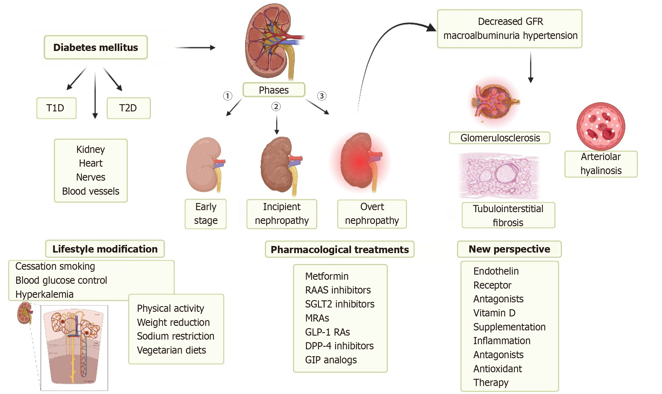 This schematic illustrates the pathogenesis, clinical progression, and current therapeutic approaches in diabetic kidney disease. Created in BioRender (Supplementary material). T1D: Type 1 diabetes; T2D: Type 2 diabetes; GFR: Glomerular filtration rate; RAAS: Renin-angiotensin-aldosterone system; SGLT2: Sodium-glucose co-transporter 2; MRA: Mineralocorticoid receptor antagonist; GLP-1 RA: Glucagon-like peptide-1 receptor agonist; DPP-4: Dipeptidyl peptidase-4; GIP: Glucose-dependent insulinotropic polypeptide.