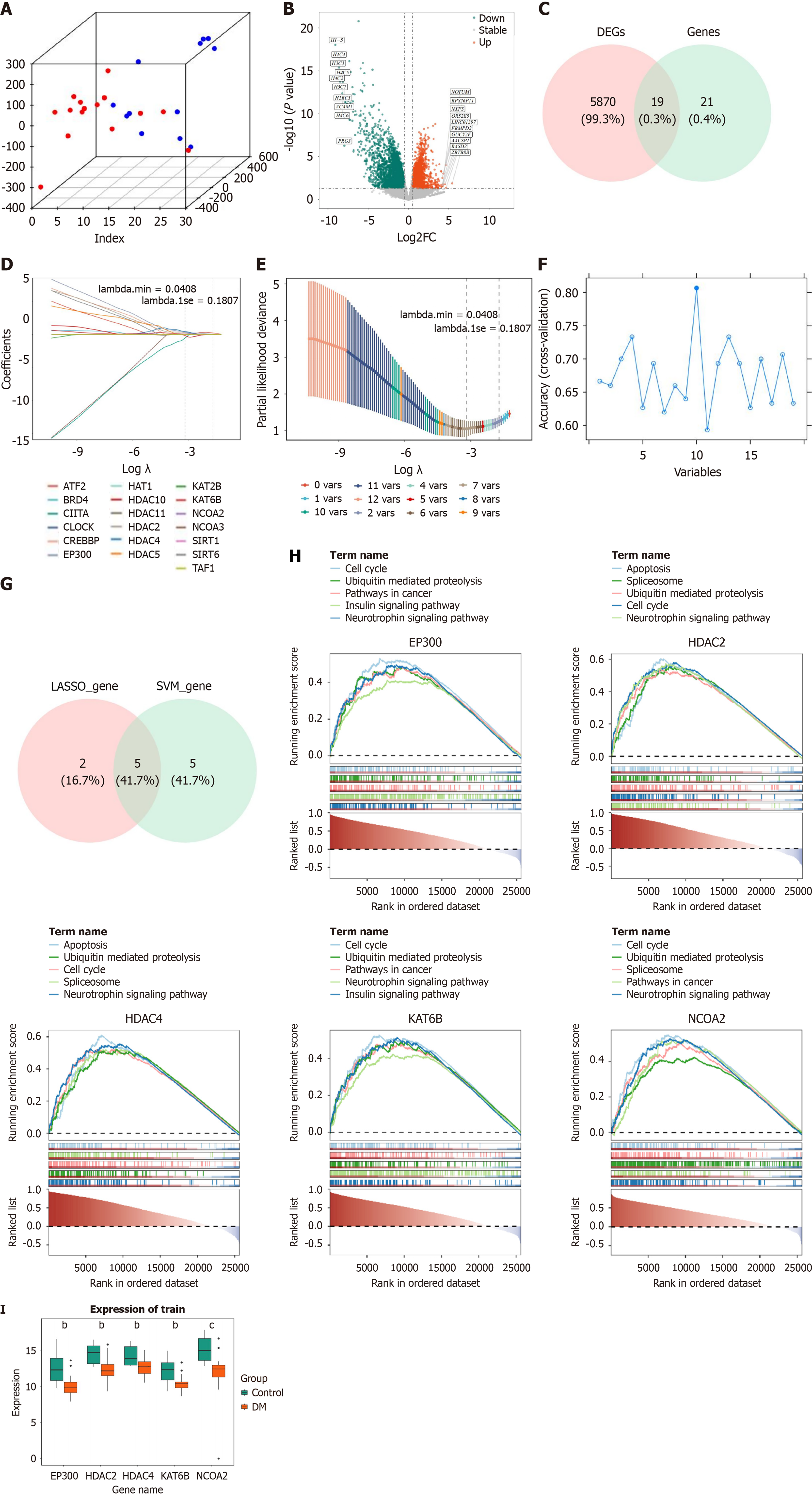 A: Three-dimensional principal component analysis ; B: Variance analysis volcano map; C: Venny plots of candidate genes; D: Penalty plot of least absolute shrinkage and selection operator logistic regression coefficients; E: Least absolute shrinkage and selection operator cross validation diagram; F: Potential biomarkers screened by machine learning-support vector machine-recursive feature elimination algorithm; G: Machine learning intersection genes; H: GSEA enrichment results for key genes; I: Box plot of key gene expression. bP < 0.01, cP < 0.001. DEGs: Differentially expressed genes; DN: Diabetic nephropathy.