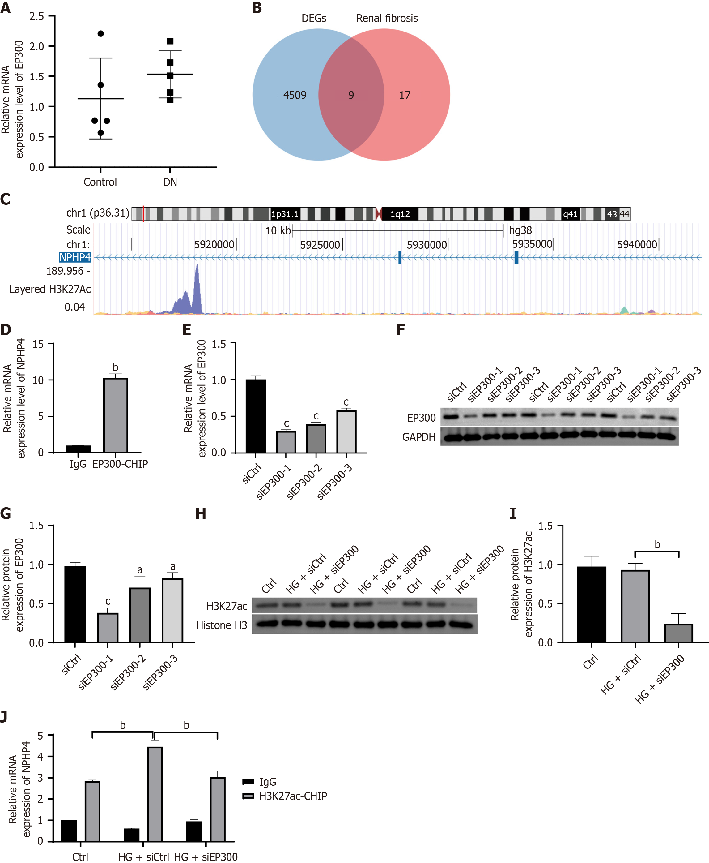 A: EP300 mRNA expression was measured using real-time quantitative polymerase chain reaction (RT-qPCR); B: Venny diagram of the intersection of EP300-regulated histone acetylation modification action targets with renal fibrosis-related targets; C: Chromatin immunoprecipitation (ChIP)-seq analysis to identify the key target nephrocystin-4 (NPHP4); D: NPHP4 gene abundance in ChIP products was measured using RT-qPCR; E: Measurement of EP300 interference efficiency using RT-qPCR; F and G: Interference efficiency of EP300 was measured using western blot; H and I: Representative western blot images and quantitative analysis of histone H3 lysine 27 protein levels; J: Enrichment of histone H3 lysine 27 at the NPHP4 locus was measured by ChIP-RT-qPCR in HK-2 cells transfected with siCtrl or small interfering RNA targeting EP300 under high glucose conditions. Data are presented as mean ± SD (n = 3). aP < 0.05, bP < 0.01, and cP < 0.001. ChIP: Chromatin immunoprecipitation; DN: Diabetic nephropathy; HG: High glucose; H3K27ac: Acetylated histone H3 lysine 27; IgG: Immunoglobulin G; siEP300: Small interfering RNA targeting EP300.