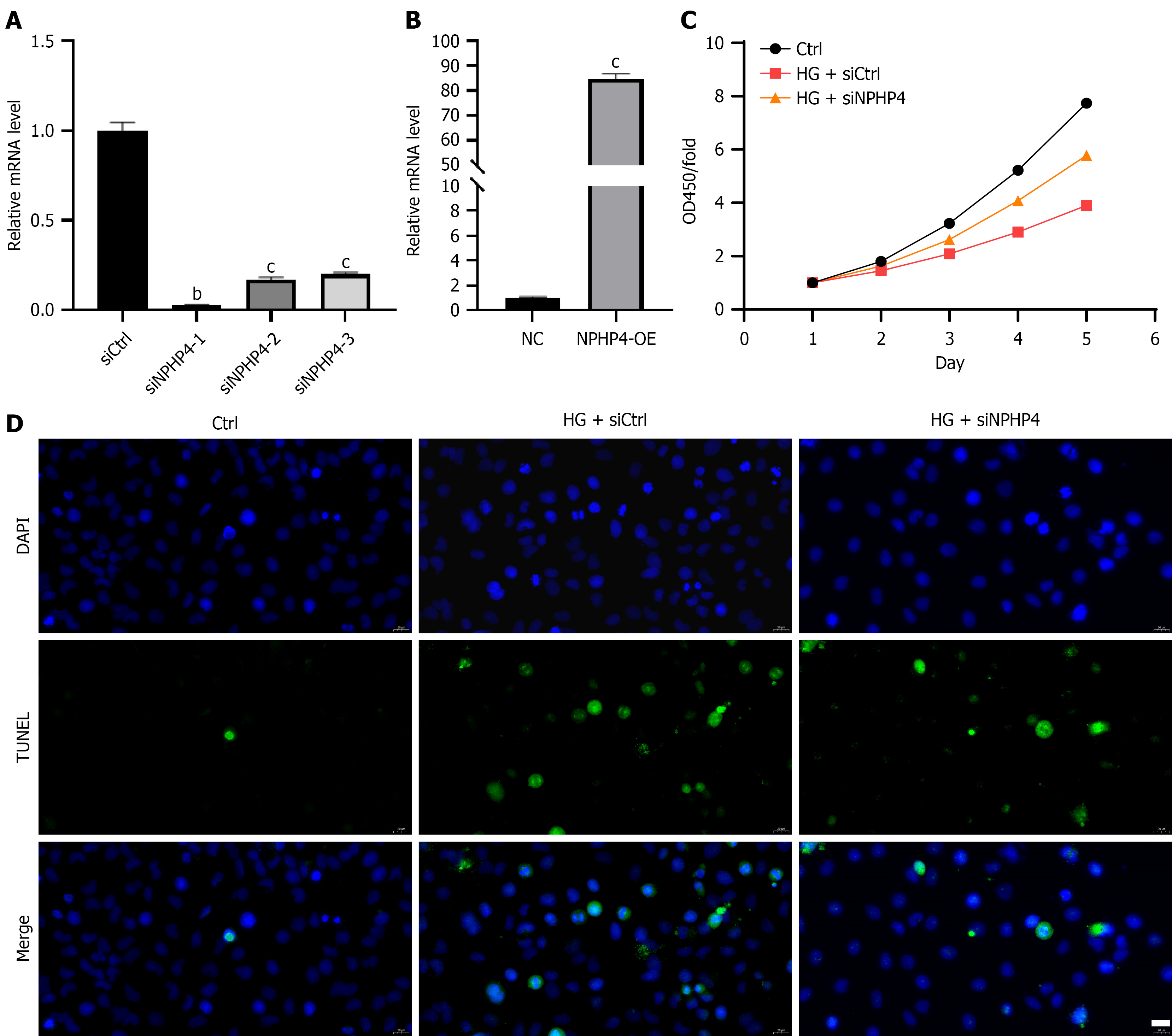 A and B: Measurement of nephrocystin-4 knockdown and overexpression efficiency in HK-2 cells by real-time quantitative polymerase chain reaction; C: Measurement of HK-2 cell viability by cell counting kit-8 assay; D: Measurement of HK-2 cell apoptosis by TUNEL staining. Scale bar = 20 µm. Data are presented as mean ± SD (n = 3). bP < 0.01, cP < 0.001. HG: High glucose; NPHP4-OE: Overexpression of nephrocystin-4; siNPHP4: Small interfering RNA targeting nephrocystin-4.