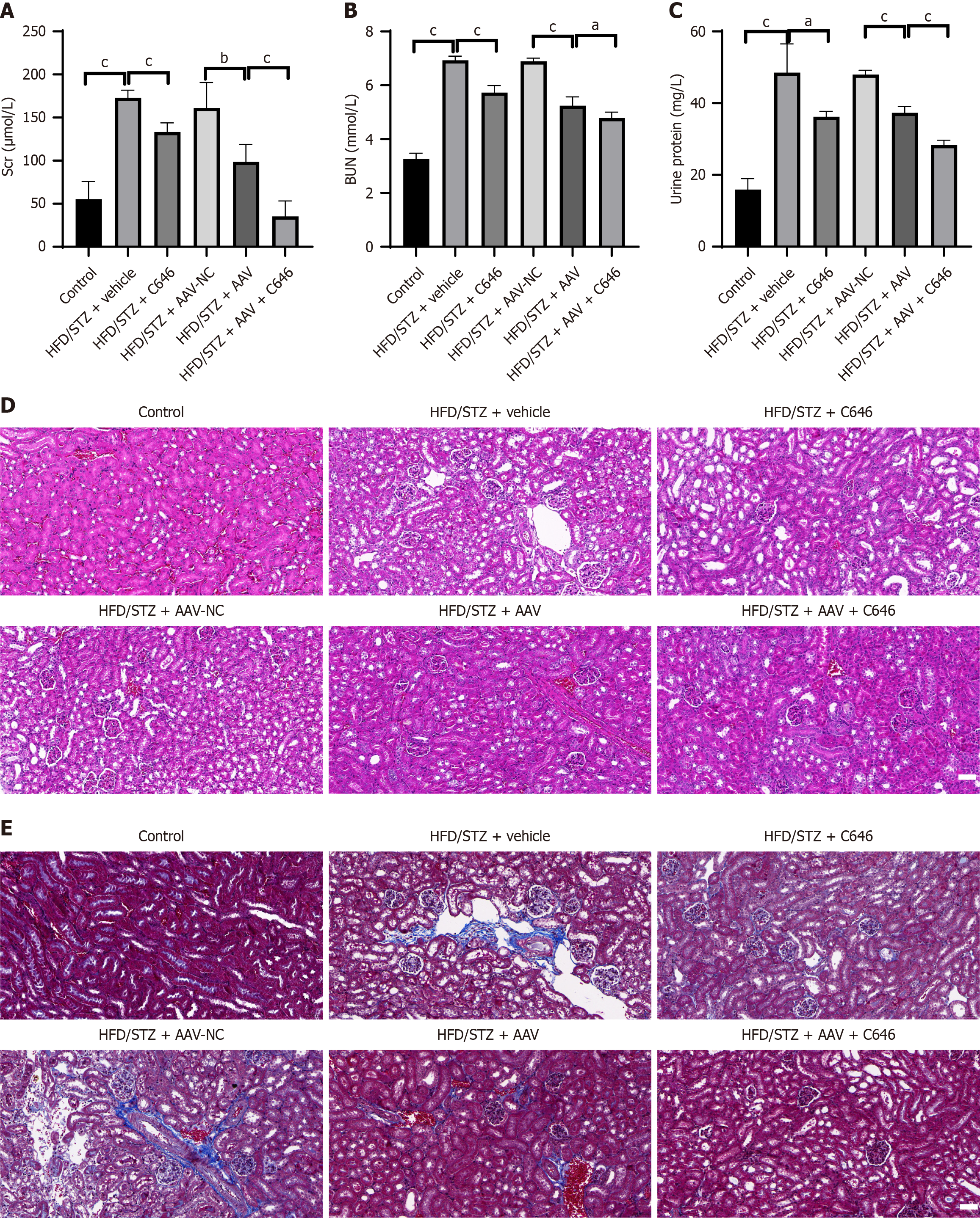 A: Serum creatinine content; B: Blood urea nitrogen content; C: Urinary protein content; D: Hematoxylin and eosin staining of renal tissue; E: Masson staining of renal tissue. Scale bar = 50 µm. Data are presented as mean ± SD (n = 3). aP < 0.05, bP < 0.01, and cP < 0.001. BUN: Blood urea nitrogen; HFD: High-fat diet; Scr: Serum creatinine; STZ: Streptozotocin.