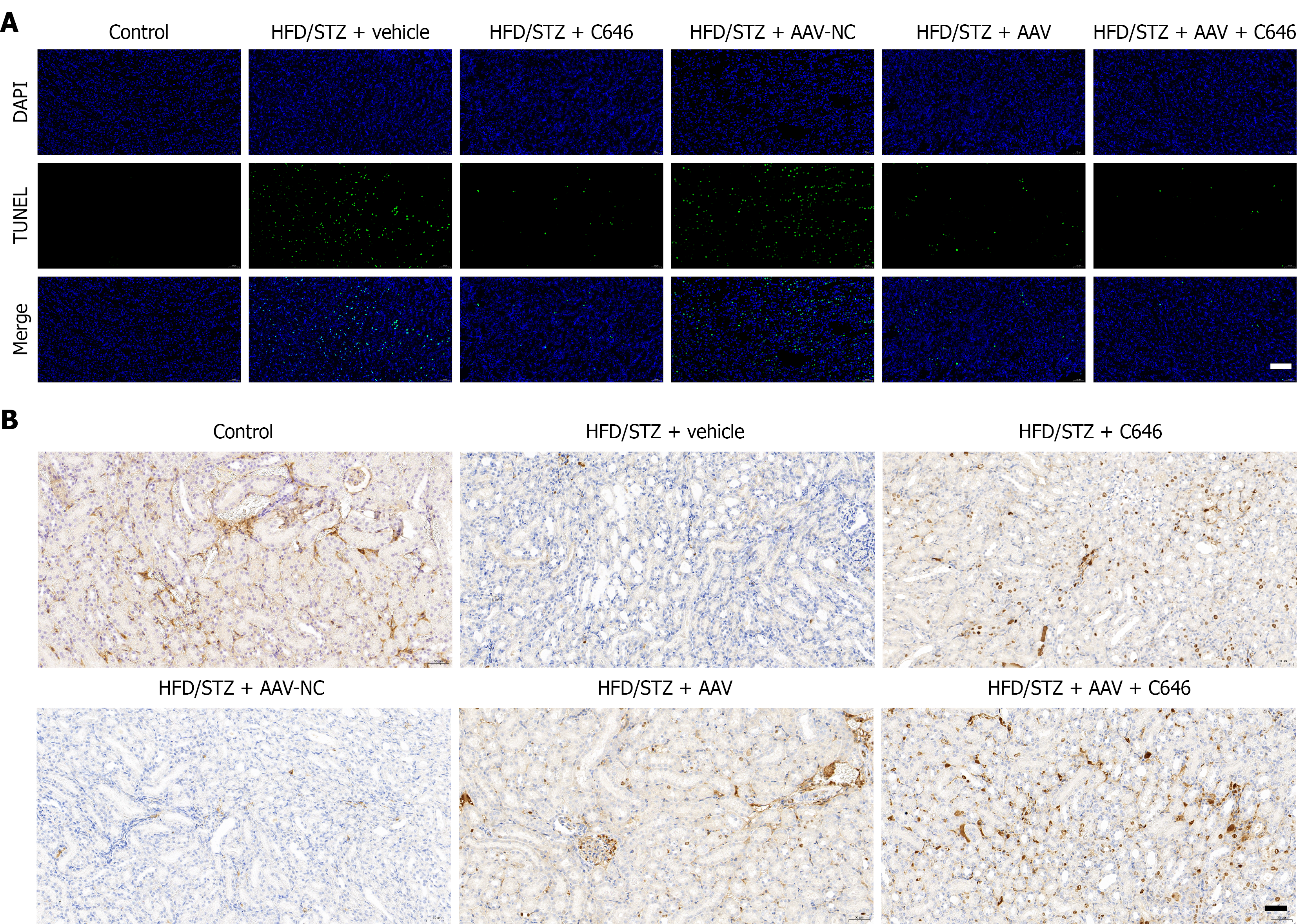 A: TUNEL staining of renal tissue; B: Measurement of Ki67 protein levels by immunohistochemistry. Scale bar = 50 µm. HFD: High-fat diet; STZ: Streptozotocin.