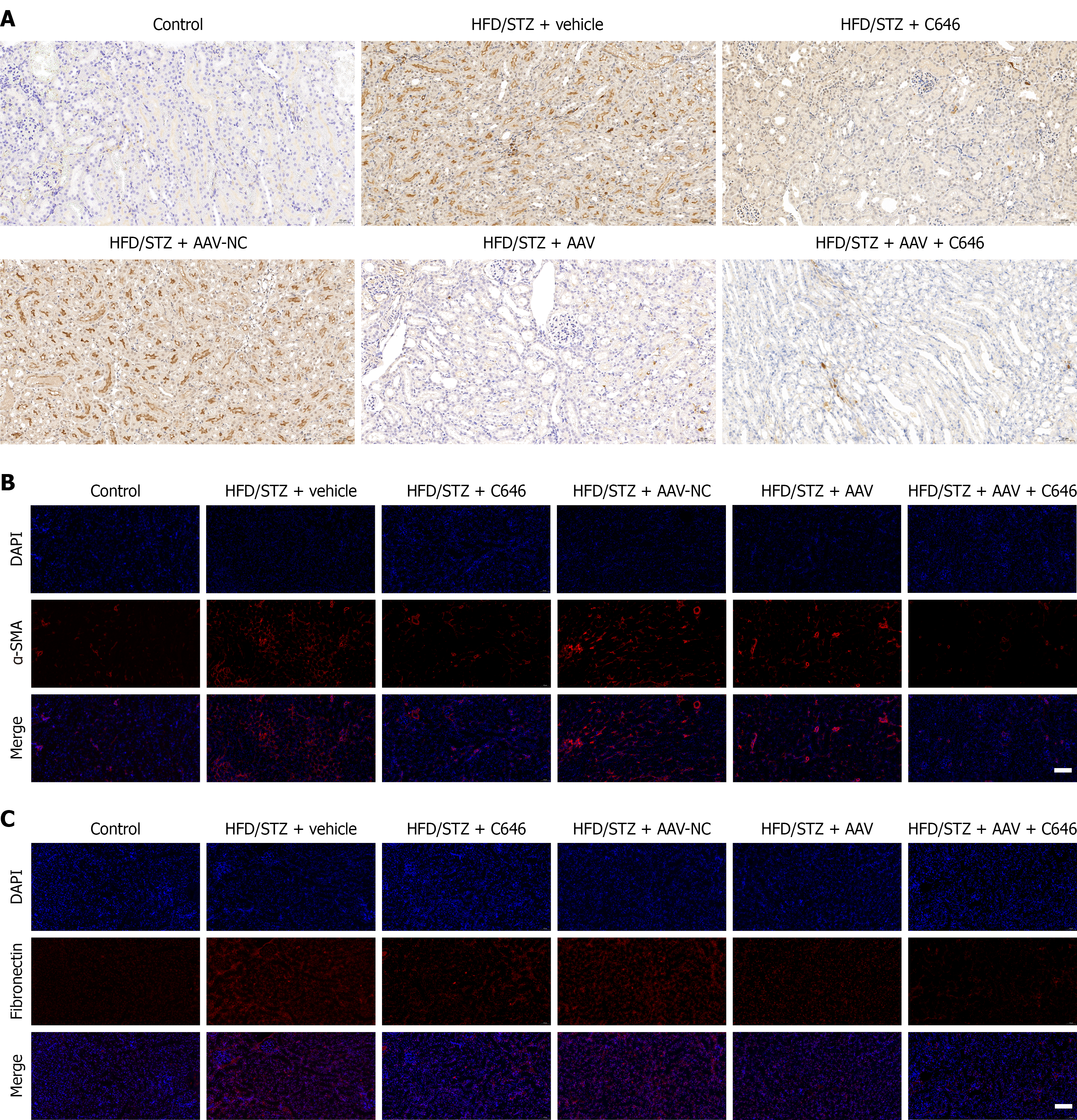 A: Measurement of nephrocystin-4 protein levels by immunohistochemistry. Scale bar = 100 µm; B: Measurement of alpha-smooth muscle actin protein levels by immunofluorescence. Scale bar = 50 µm; C: Measurement of fibronectin protein levels by immunofluorescence. Scale bar = 50 µm. α-SMA: Alpha-smooth muscle actin; HFD: High-fat diet; STZ: Streptozotocin.