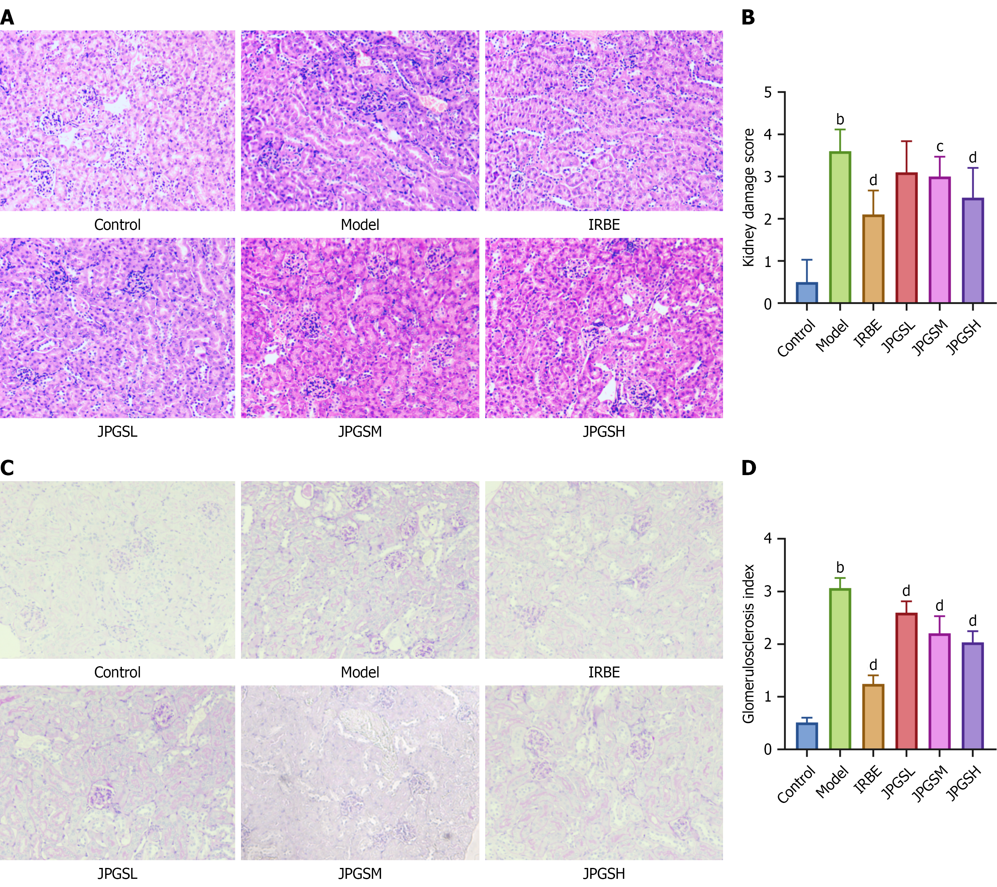 A: Hematoxylin and eosin staining; B: Kidney damage score; C: Periodic acid Schiff staining; D: Glomerulosclerosis index. Magnification, × 100. bP < 0.01 as compared to the control group; cP < 0.05 as compared to the model group; dP < 0.01 as compared to the model group. JPGSL: Low-dose Jianpi Gushen Huayu Decoction; JPGSM: Medium-dose Jianpi Gushen Huayu Decoction; JPGSH: High-dose Jianpi Gushen Huayu Decoction; IRBE: Irbesartan.