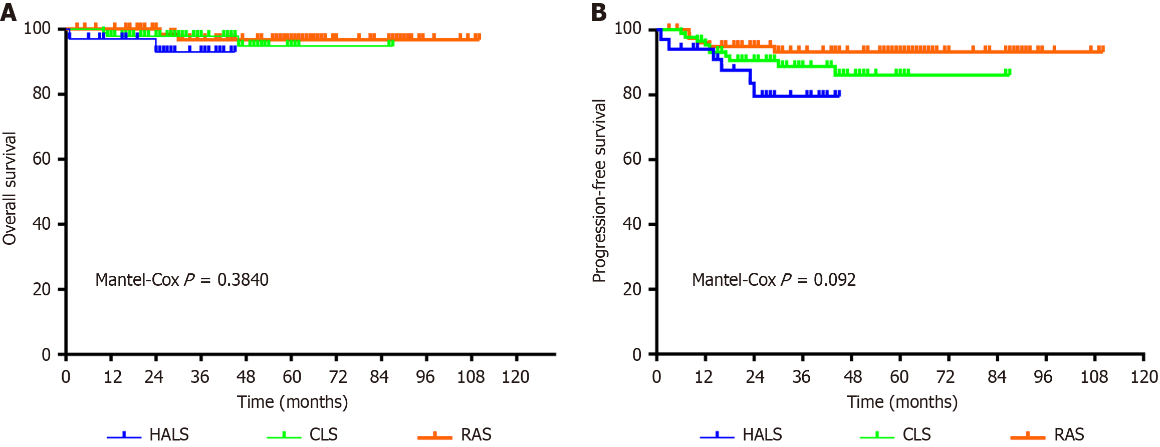 A: Overall survival; B: Progression-free survival. RAS: Robotic-assisted surgery; HALS: Hand-assisted laparoscopic surgery; CLS: Conventional laparoscopic surgery.