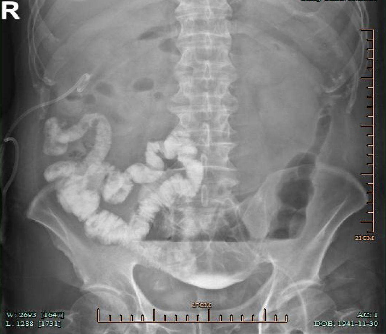 After injection of contrast agent through the original abdominal drainage tube in the left lower abdomen, the abdominal plain radiograph showed the small intestine in the right middle and lower abdomen filled with contrast agent.