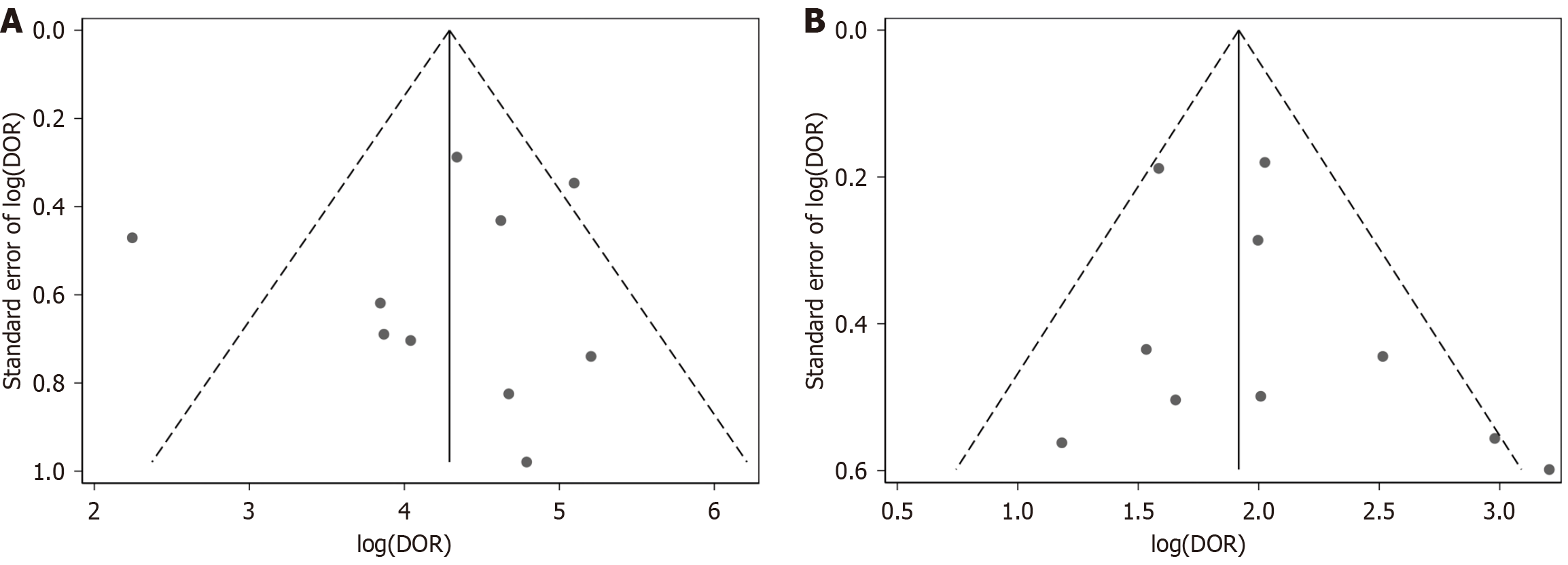 A: Funnel plot for the artificial intelligence-enabled real-time computer-aided detection system group, showing the distribution of logarithm of diagnostic odds ratios log(DOR) values against their standard errors; B: Funnel plot for the endoscopist group, showing the distribution of log(DOR) values against their standard errors. DOR: Diagnostic odds ratio.