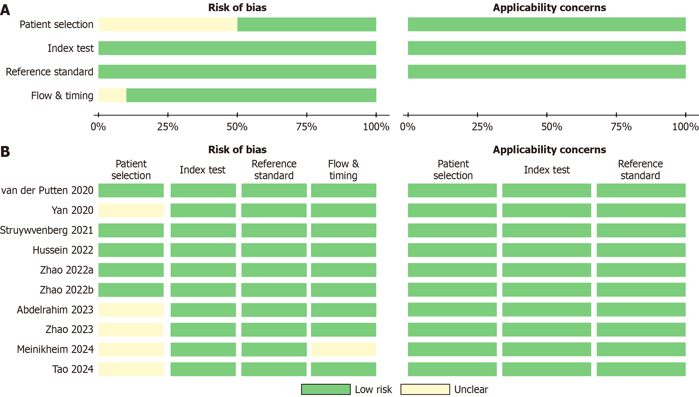 A: Overall risk of bias and applicability concerns across all included studies; B: Risk of bias and applicability concerns for each individual study.