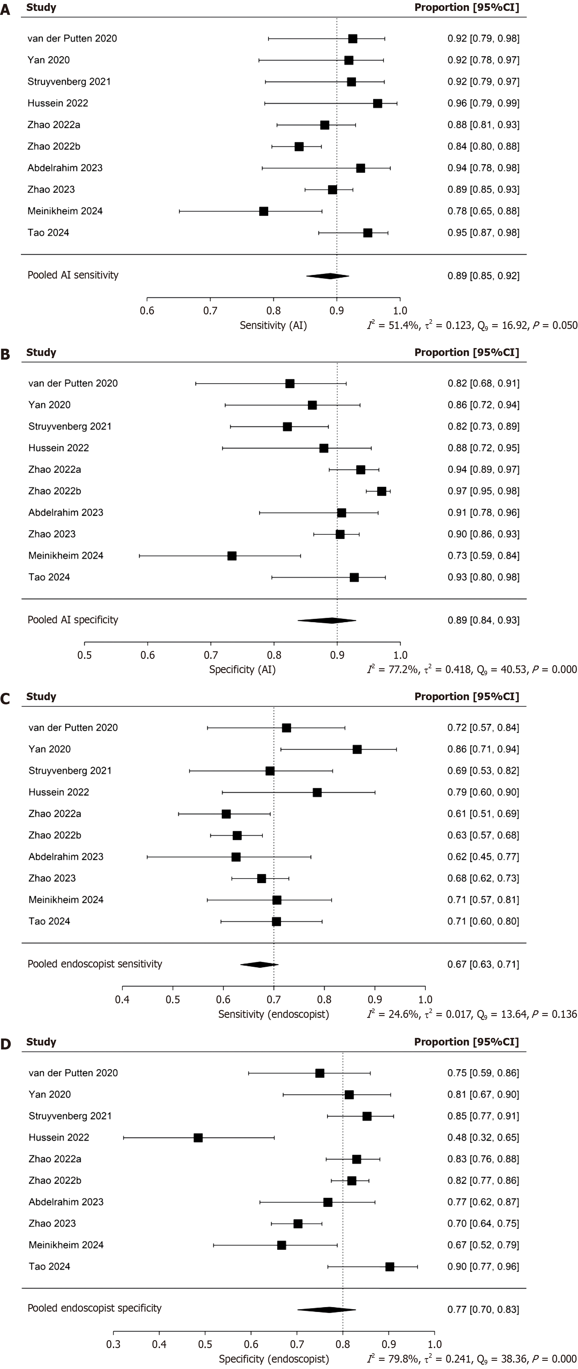 A: Pooled sensitivity for artificial intelligence-enhanced real-time computer-aided detection systems (AI-CAD) group; B: Pooled specificity for AI-CAD group; C: Pooled sensitivity for endoscopist group; D: Pooled specificity for endoscopist group.
