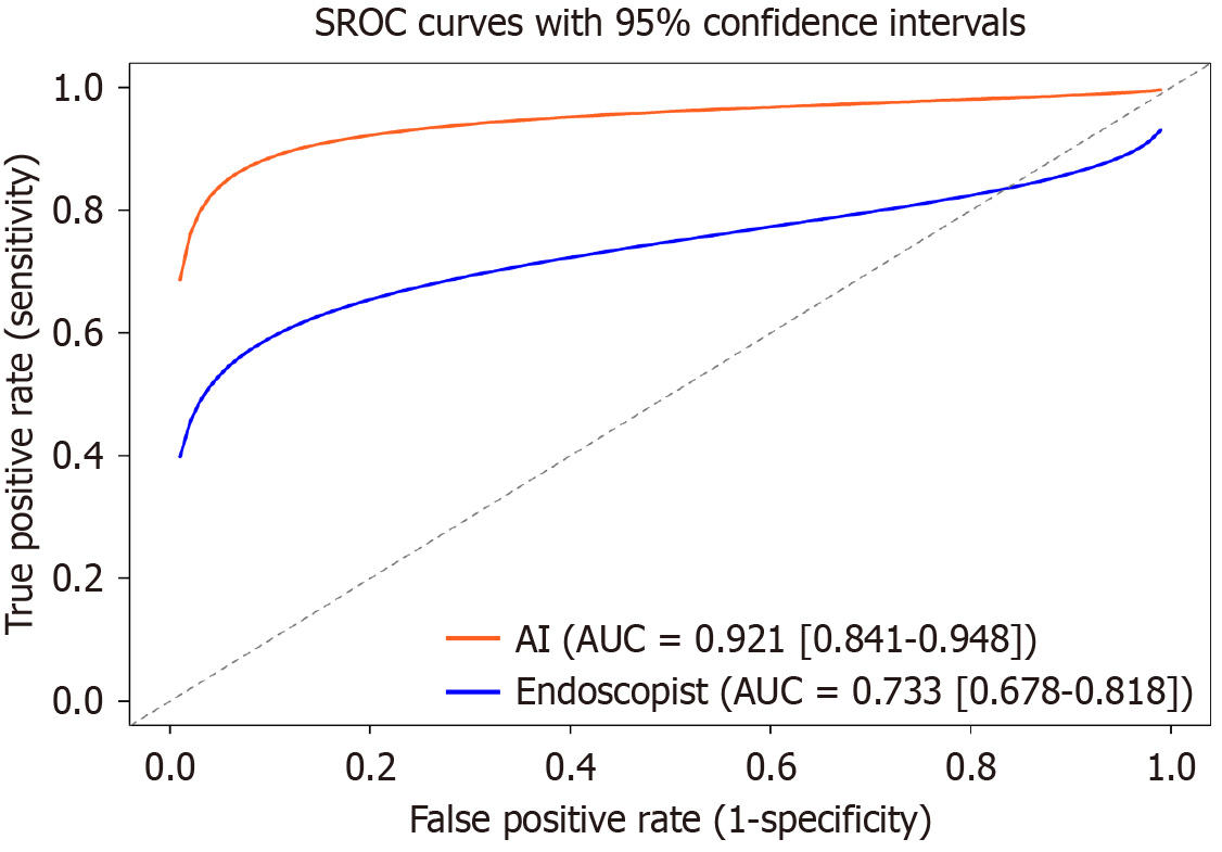 Figure 5 Combined summary receiver operating characteristic plot of artificial intelligence-assisted and endoscopist-only diagnosis.