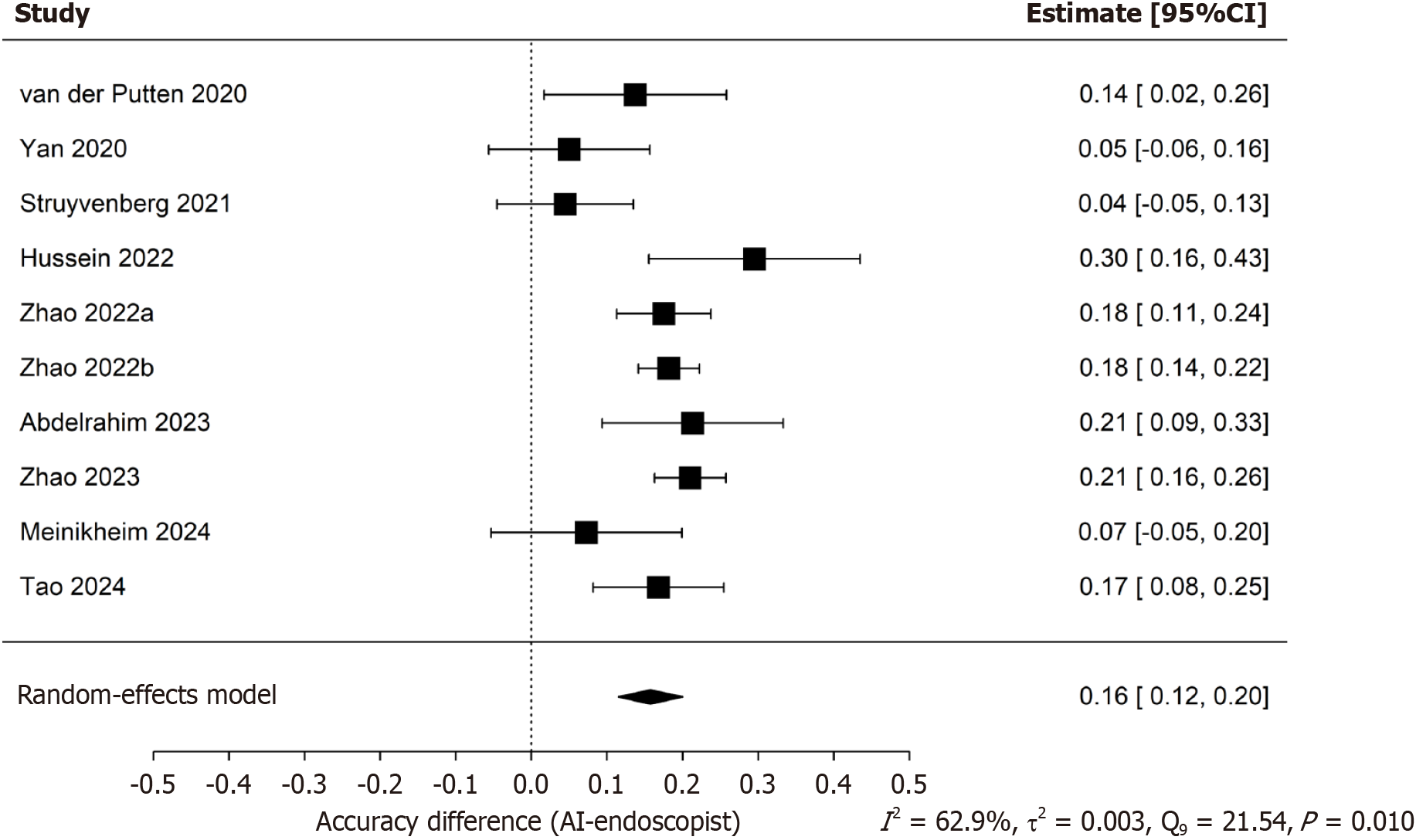 Each horizontal line represents the 95% confidence interval (CI) for the accuracy difference in an individual study. A positive value indicates that the Artificial intelligence-enhanced real-time computer-aided detection systems system had higher diagnostic accuracy than endoscopists. The size of the square reflects the weight of each study in the meta-analysis, and the diamond at the bottom represents the pooled effect estimate with its 95%CI, calculated using a random-effects model. CI: Confidence interval.
