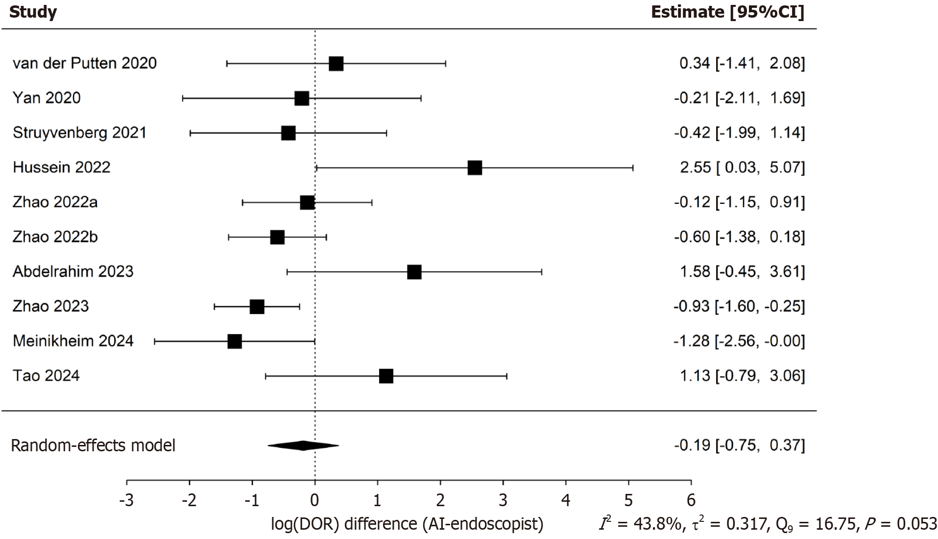 Figure 7 Forest plots of pooled logarithm of diagnostic odds ratios difference between artificial intelligence-enhanced real-time com puter-aided detection systems and conventional endoscopists across all included studies.