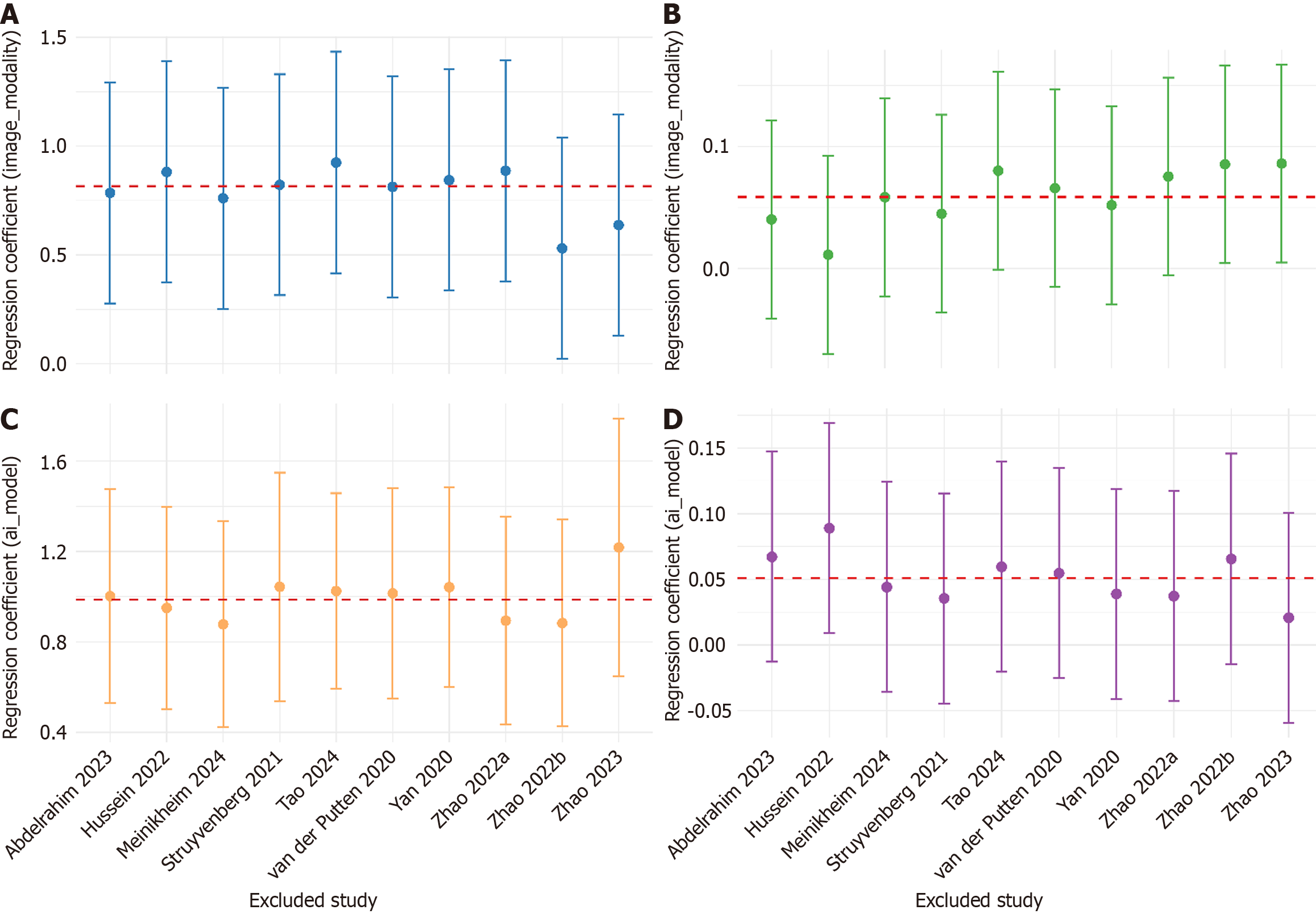 A: Leave-one-out (LOO) sensitivity analysis of artificial intelligence-enhanced real-time computer-aided detection systems (AI-CAD) group specificity, stratified by imaging modality; B: LOO sensitivity analysis of accuracy difference, stratified by imaging modality; C: LOO sensitivity analysis of AI-CAD group specificity, stratified by artificial intelligence (AI) model; D: LOO sensitivity analysis of accuracy difference, stratified by AI model.