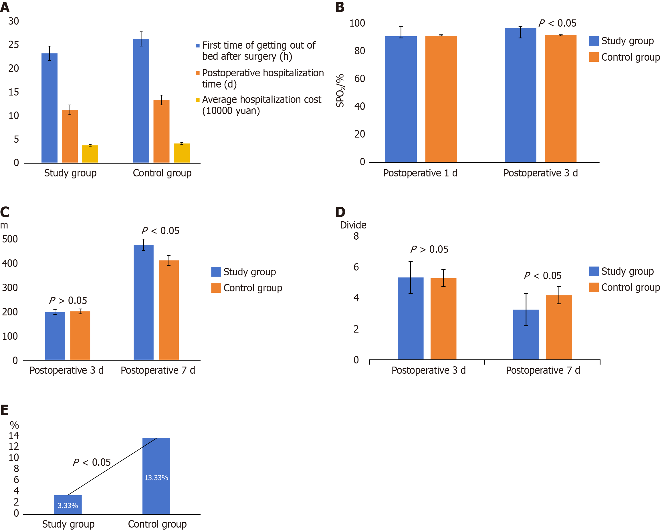 A: Comparison of surgical conditions in different groups; B: Comparison of SPO2 levels at different nodes between groups after surgery; C: Comparison of 6-minute walk distance levels at different nodes between groups after surgery; D: Comparison of Borg scores of different nodes between groups; E: Comparison of incidences of postoperative complications between groups.