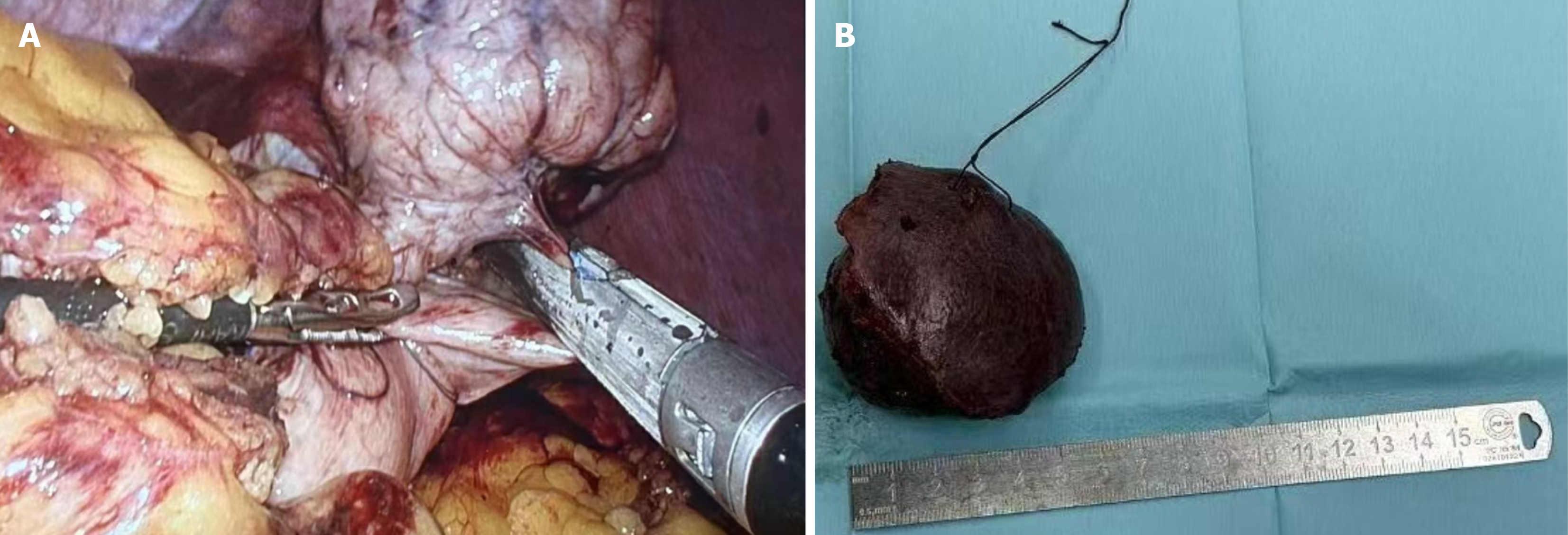 A: Laparoscopic left hemihepatectomy; B: Laparoscopic hepatic resection of the tumour.