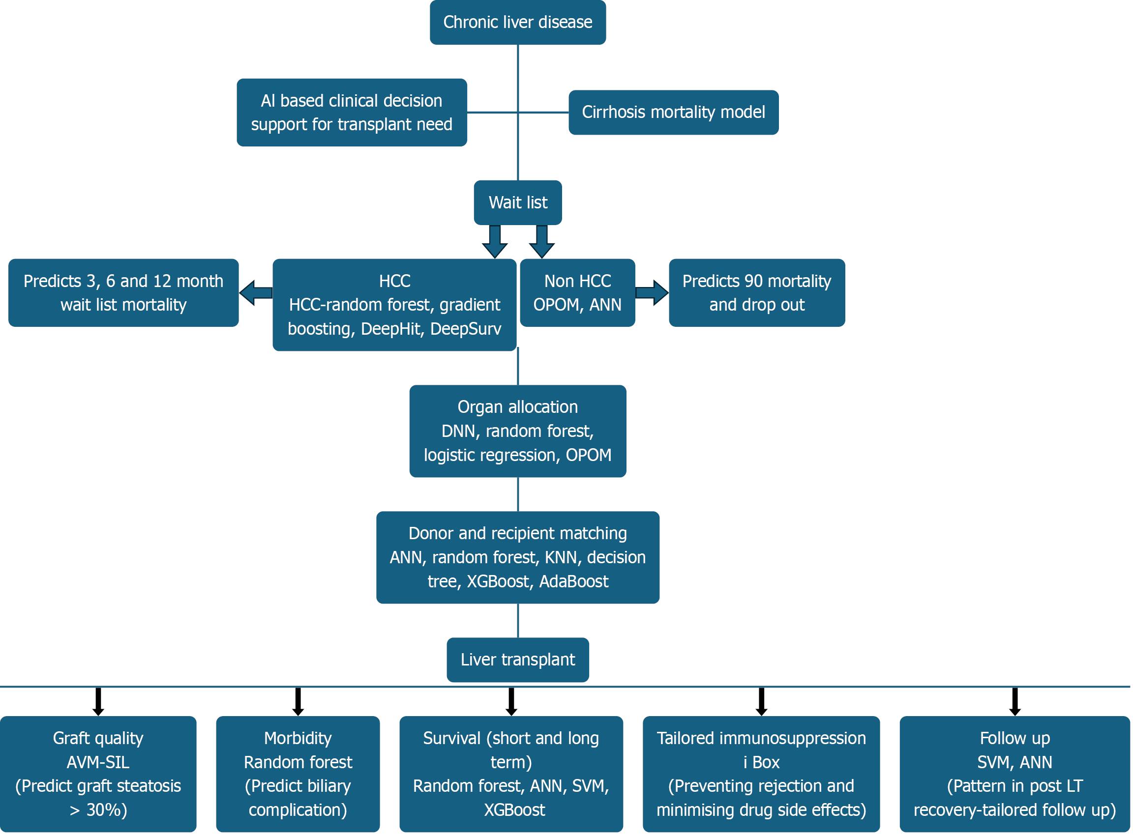 HCC: Hepatocellular carcinoma; ANN: Artificial neural network; OPOM: Optimised prediction of mortality; SVM: Support vector machines; AVM-SIL: Support vector machine-single instance learning; XGBoost: eXtreme Gradient Boosting; LT: Liver transplantation.