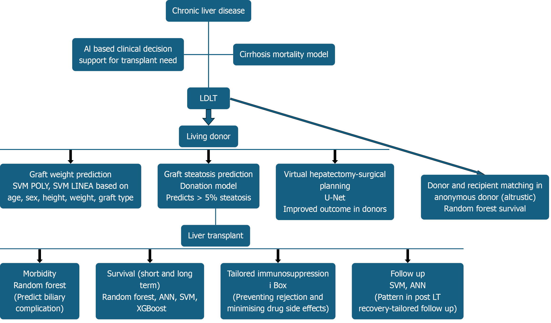 SVM-POLY: Support Vector Machine-Polynomial kernel; SVM-LINEA: Support Vector Machine Linear; U-Net: Convolutional neural network architecture, named after distinctive U shape; ANN: Artificial neural network; SVM: Support vector machine; XGBoost: eXtreme Gradient Boosting; LDLT: Living donor liver transplantation.