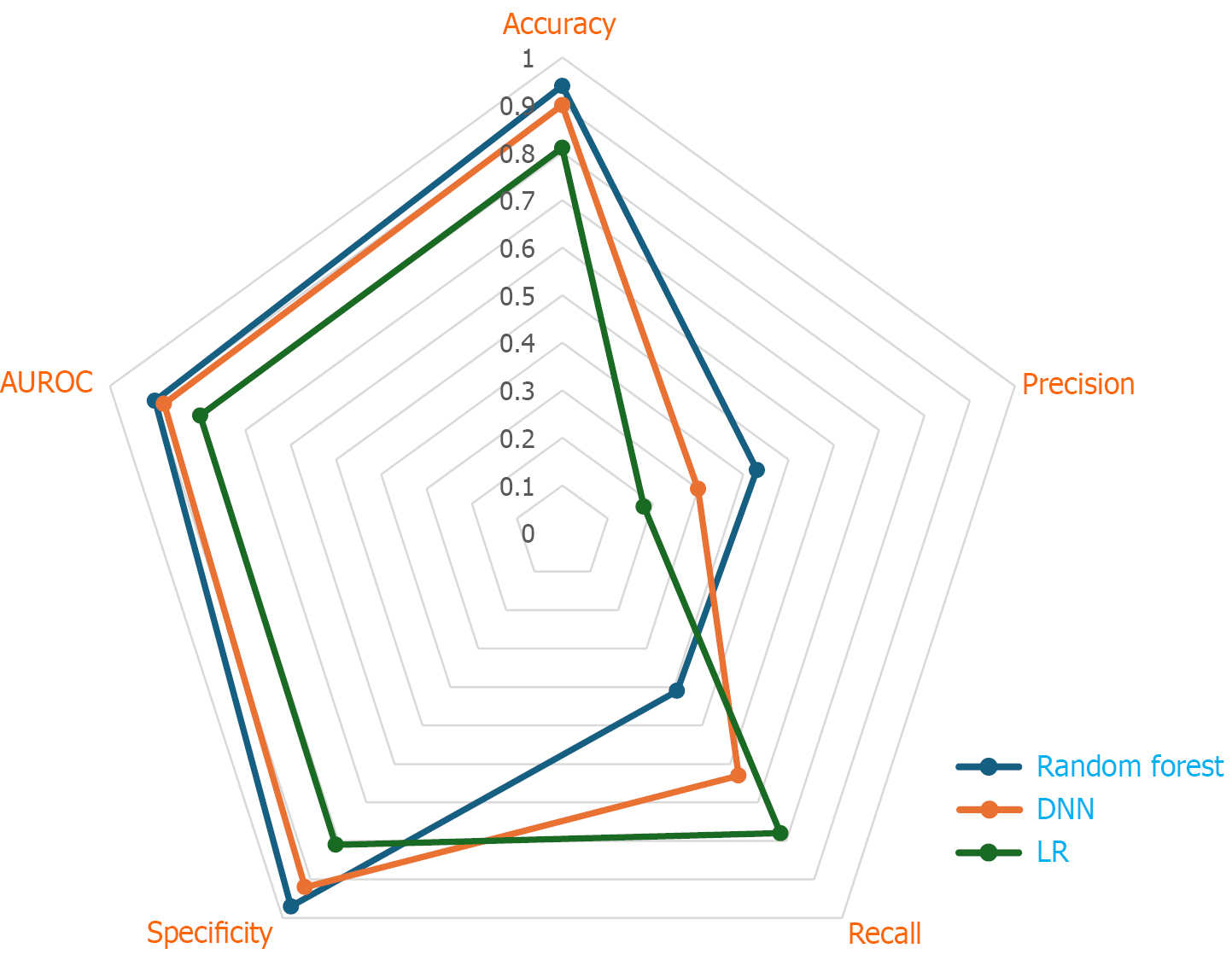 AUROC: Area under the receiver operating characteristic curve; DNN: Deep neural networks; LR: Logistic regression.