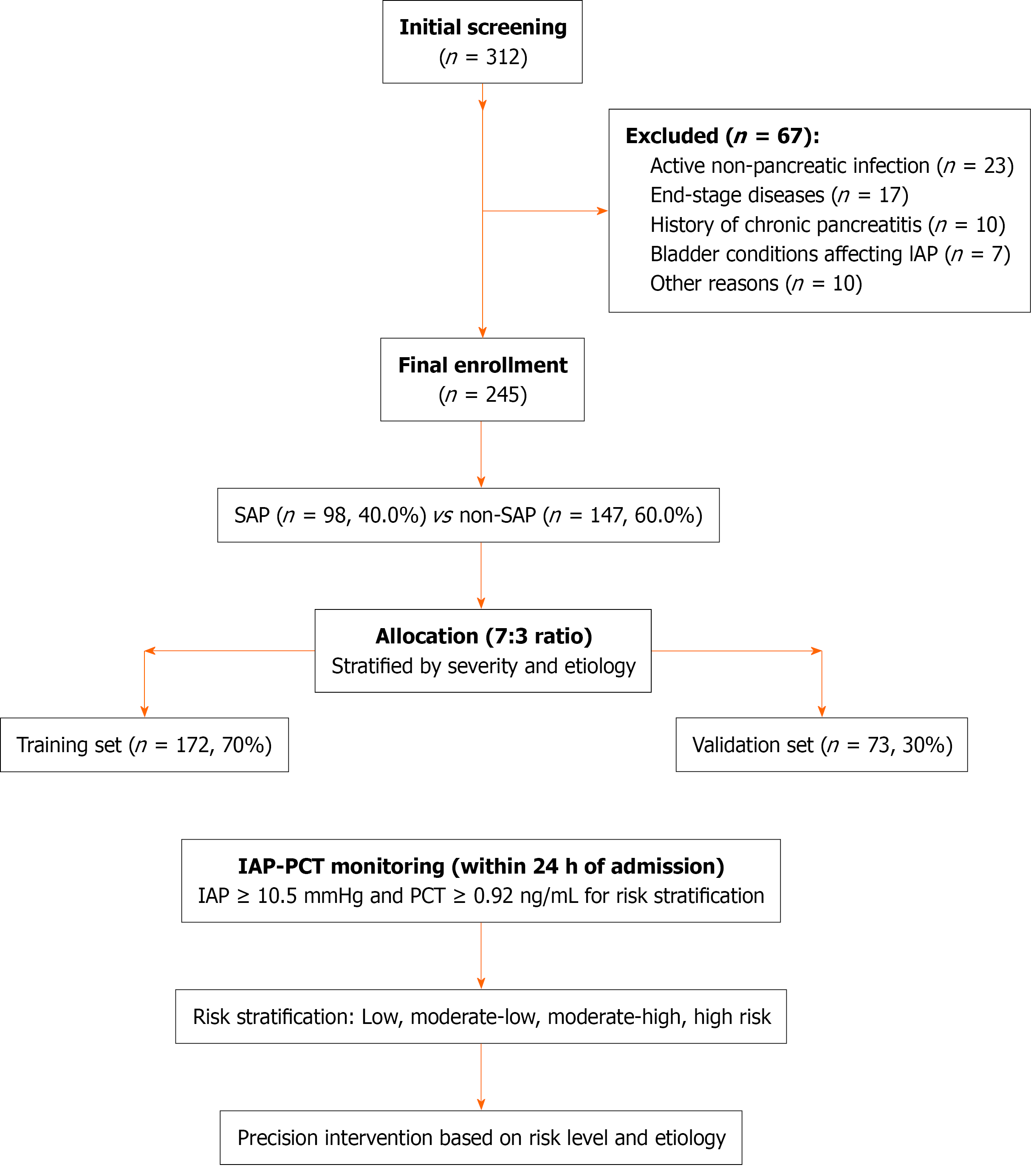 Flow diagram depicting patient selection (312 screened; 245 enrolled) with 7:3 randomization to training (n = 172) and validation sets (n = 73) for model development and independent evaluation, respectively. IAP: Intra-abdominal pressure; PCT: Procalcitonin; SAP: Severe acute pancreatitis.